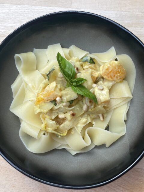 300g Chicorée 200g Bandnudeln 1 kleine Knoblauchzehe 15g Pinienkerne Saft einer Orange…