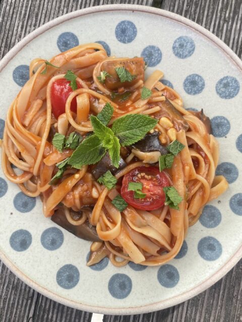 1-2 Auberginen 2 Knoblauchzehen 1 Zwiebel 25g Pinienkerne 350g Spaghetti 500g passierte…