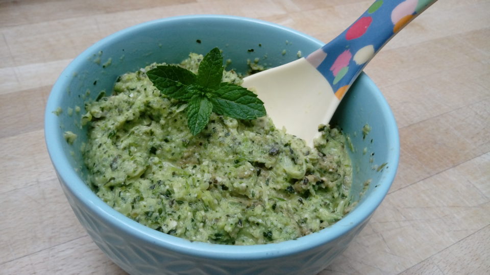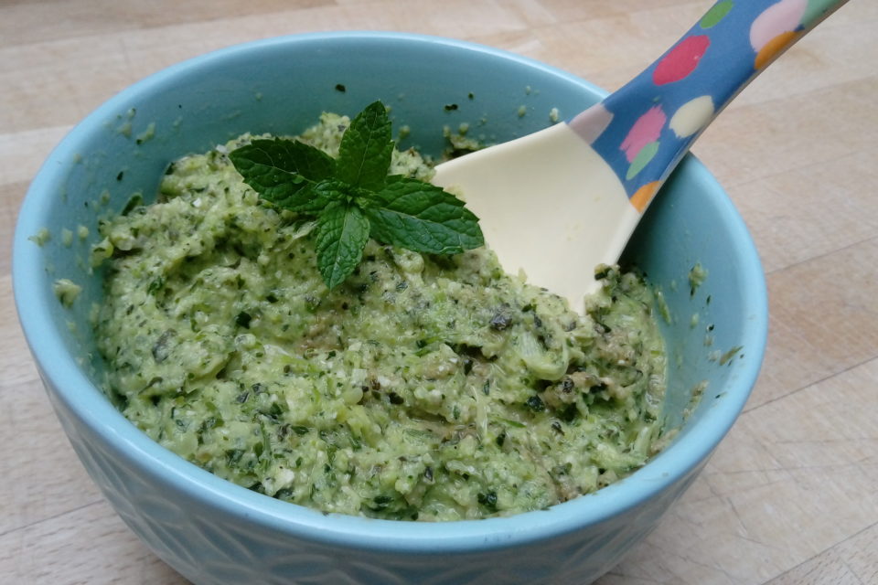 Lauchzwiebeln und Zucchini mit etwas Olivenöl anbraten- Knoblauch nur kurz mitbraten. Ebenfalls in den Mixbehälter geben. Minze und Basilikum dazu, mit Pfeffer und Salz würzen, einen guten Schuss Olivenöl zugeben und alles pürieren.