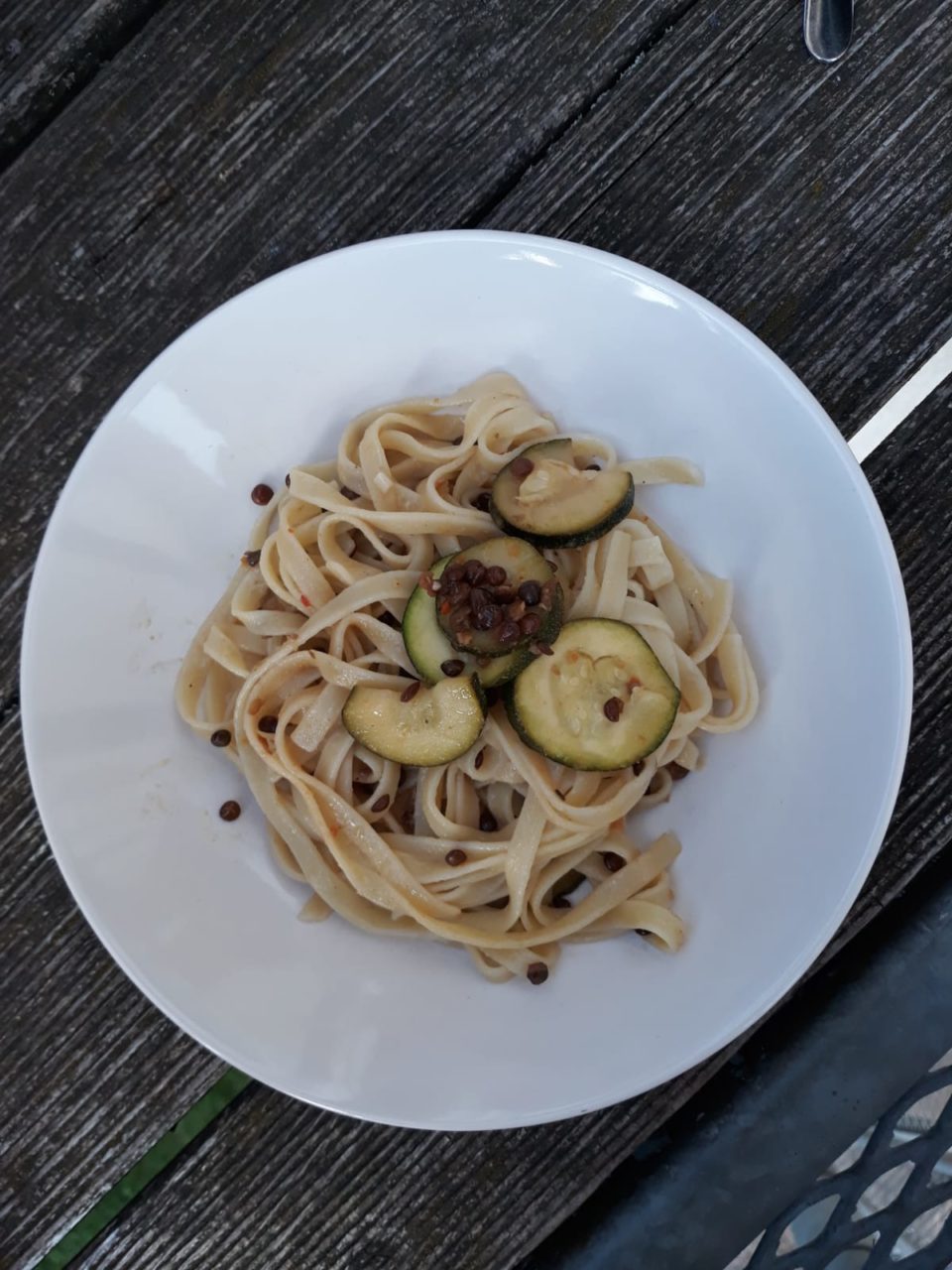 Linsen kochen und währenddessen Zucchini in Scheiben schneiden-bei Bedarf vorher halbieren. Den Knoblauch fein würfeln und die Zitrone auspressen. Nudeln aufstellen und in der Zwischenzeit die Zucchini mit etwas Bratöl goldbraun braten. Den Knoblauch am Ende zugeben und nur kurz mitbraten. Zitronensaft unterrühren und mit Chili, Salz und Pfeffer abschmecken. Nudeln tropfnass mit Zucchini und Linsen vermengen- einen Schuss gutes Olivenöl unterrühren!