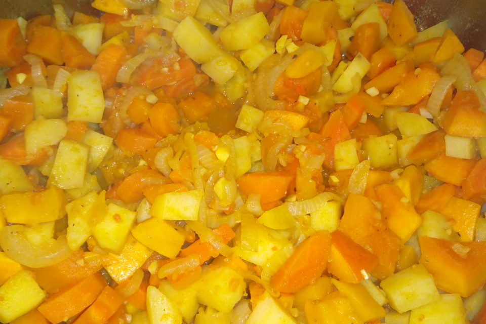 Reichlich Öl in einem großen Topf erhitzen, Gemüse und Zwiebeln hineingeben und anbraten. Mit Salz, Pfeffer und etwas Cayennepfeffer würzen. Etwas Wasser dazugeben und unter gelegentlichem Rühren bei geschlossenem Deckel ca. 12-15 Minuten garen.