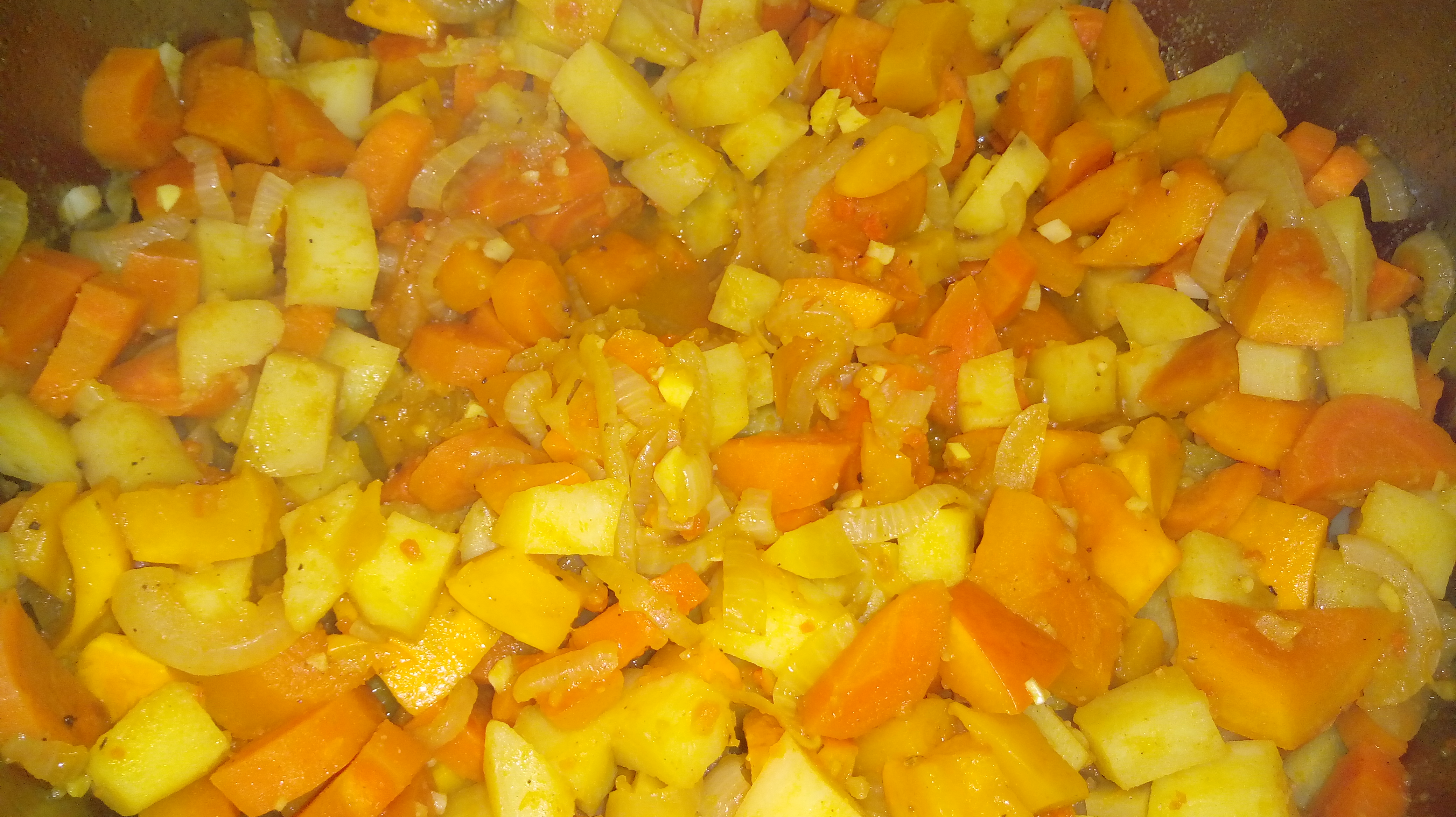 Kürbis, Möhren und Kartoffeln vorbereiten und in etwa gleichgroße Würfel schneiden. Zwiebeln schälen, halbieren und in etwa 1cm breite Streifen schneiden.