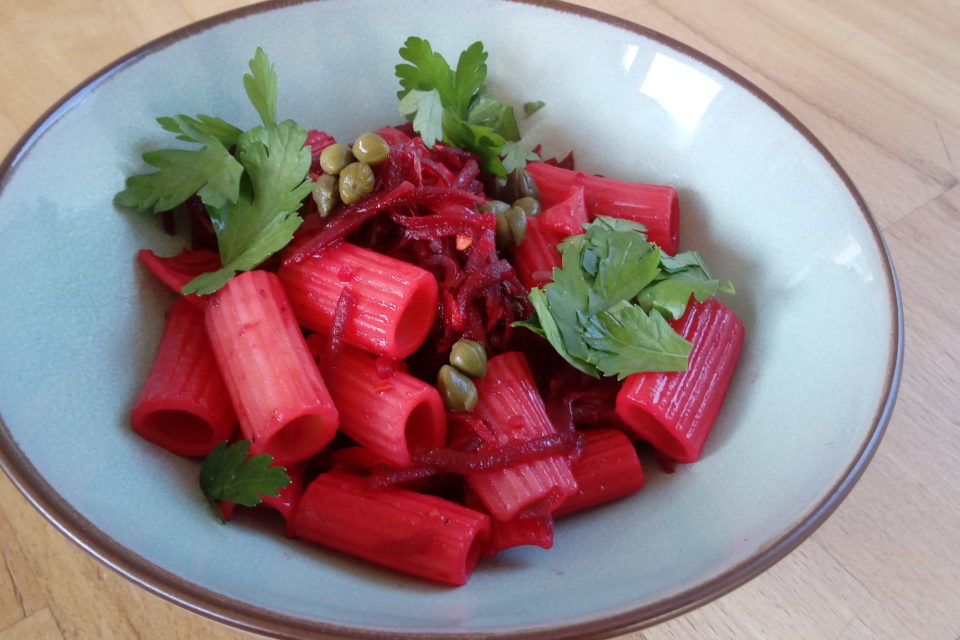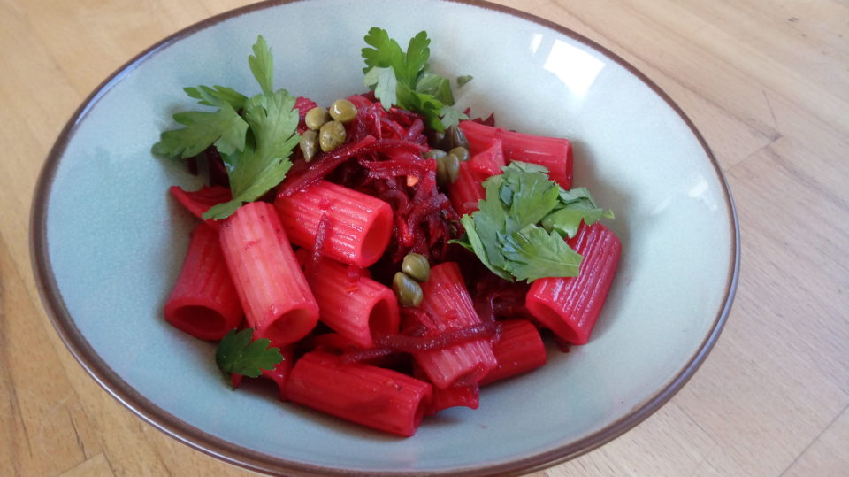 Pasta abgießen und zu den rote Beeten geben, Kapern und gehackte Petersilie untermischen und mit veganem Parmesan servieren.