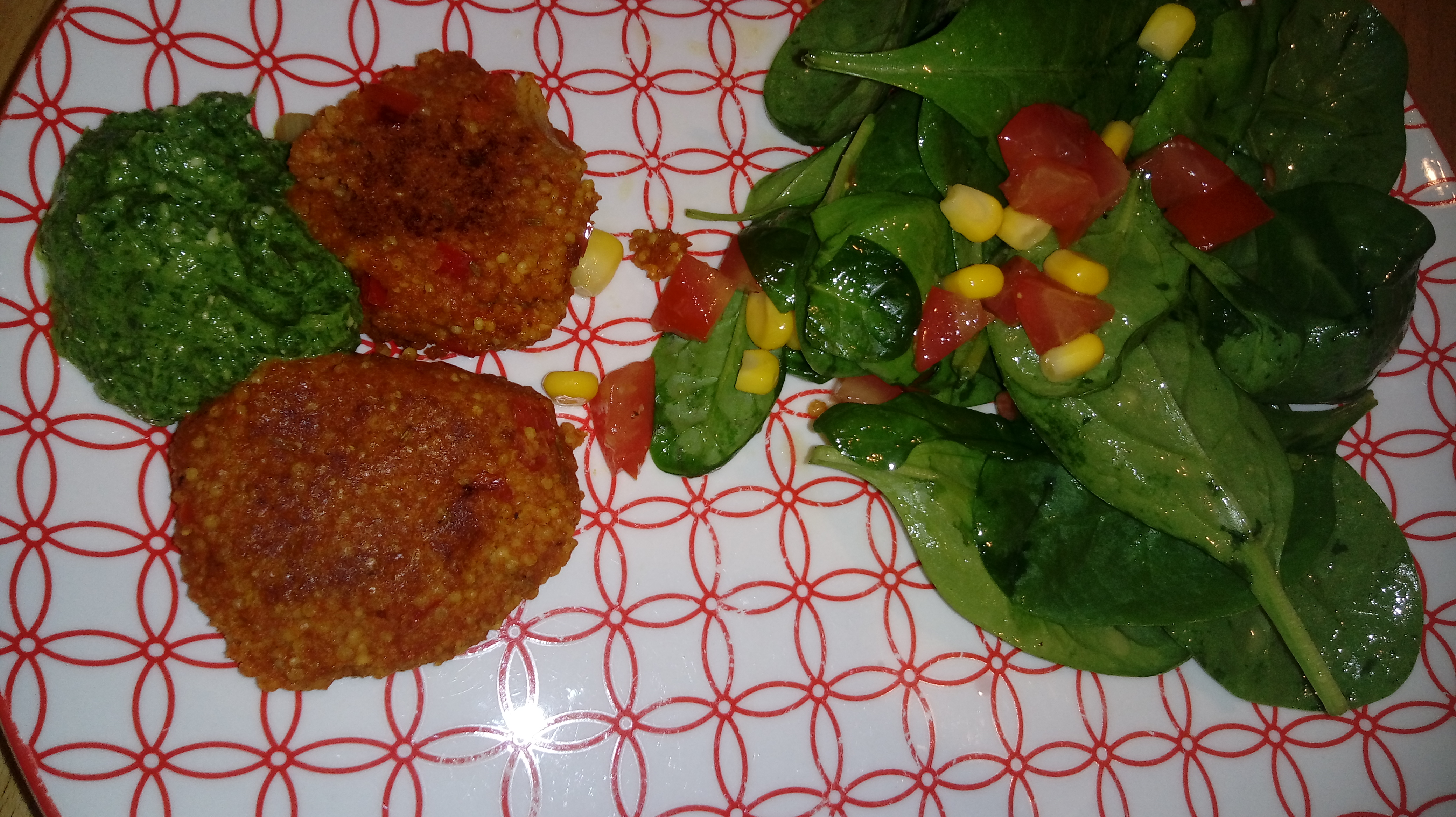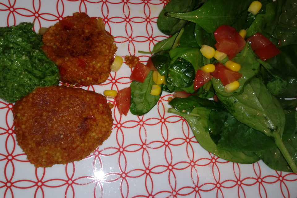 Hirse in Gemüsebrühe kochen- gegebenenfalls abgießen. In der Zwischenzeit Zwiebel und Paprika fein würfeln. Zur Hirse geben und mit Tomatenmark und Gewürzen vermengen. Mit Salz und Pfeffer abschmecken. Bratlinge formen und in heißem Öl backen.