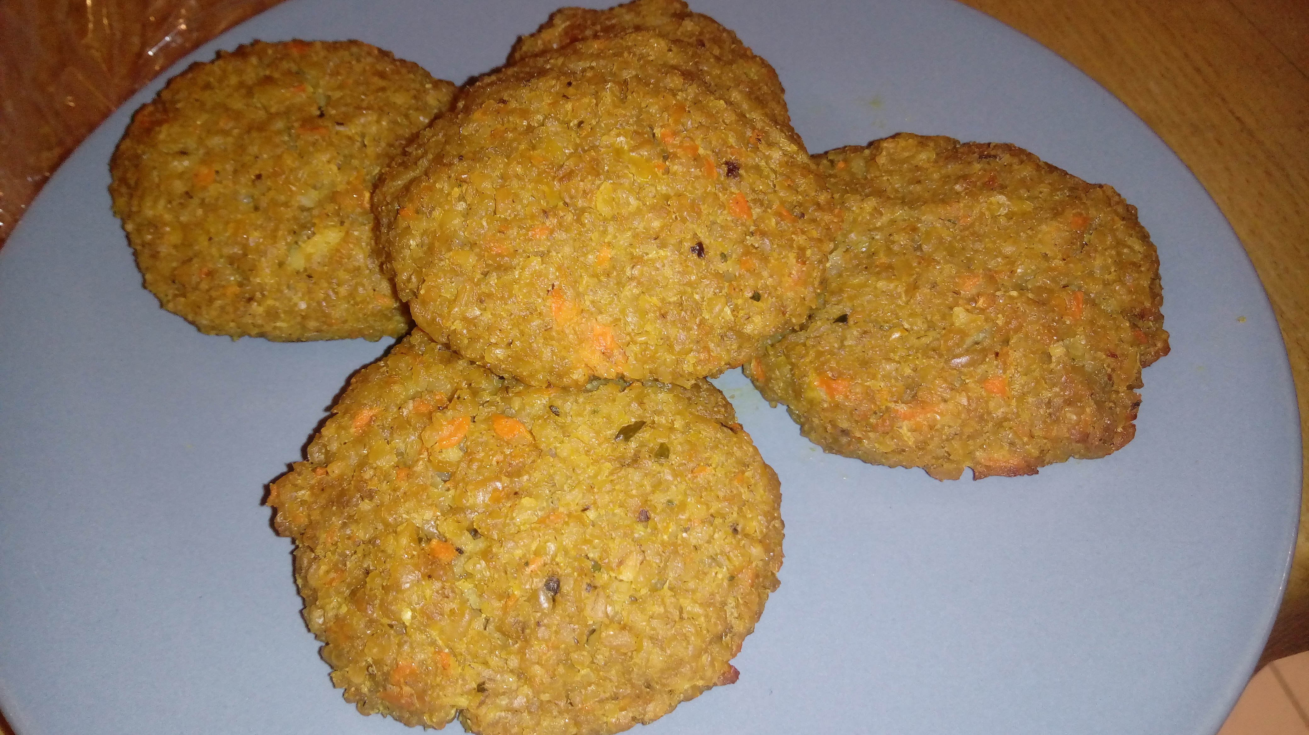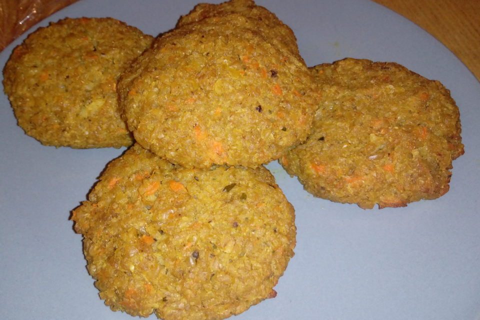 Zwiebel kleinschneiden und andünsten, fein gewürfelten Knoblauch kurz mitbraten. Klein geschnittenes Gemüse, Lorbeerblatt und Grünkernschrot zugeben- mit Gemüsebrühe auffüllen und ca. 15 Minuten bei kleiner Hitze köcheln lassen. Etwas 25 Minuten quellen lassen. Wenn die Masse abgekühlt ist, Sojamehl, Sojasoße, Hefeflocken und Piment unterrühren. Mit Salz und Pfeffer abschmecken. Bratlinge formen und in heißem Öl braten oder bei 180 grad Umluft im Backofen ca. 15 Minuten knusprig backen.