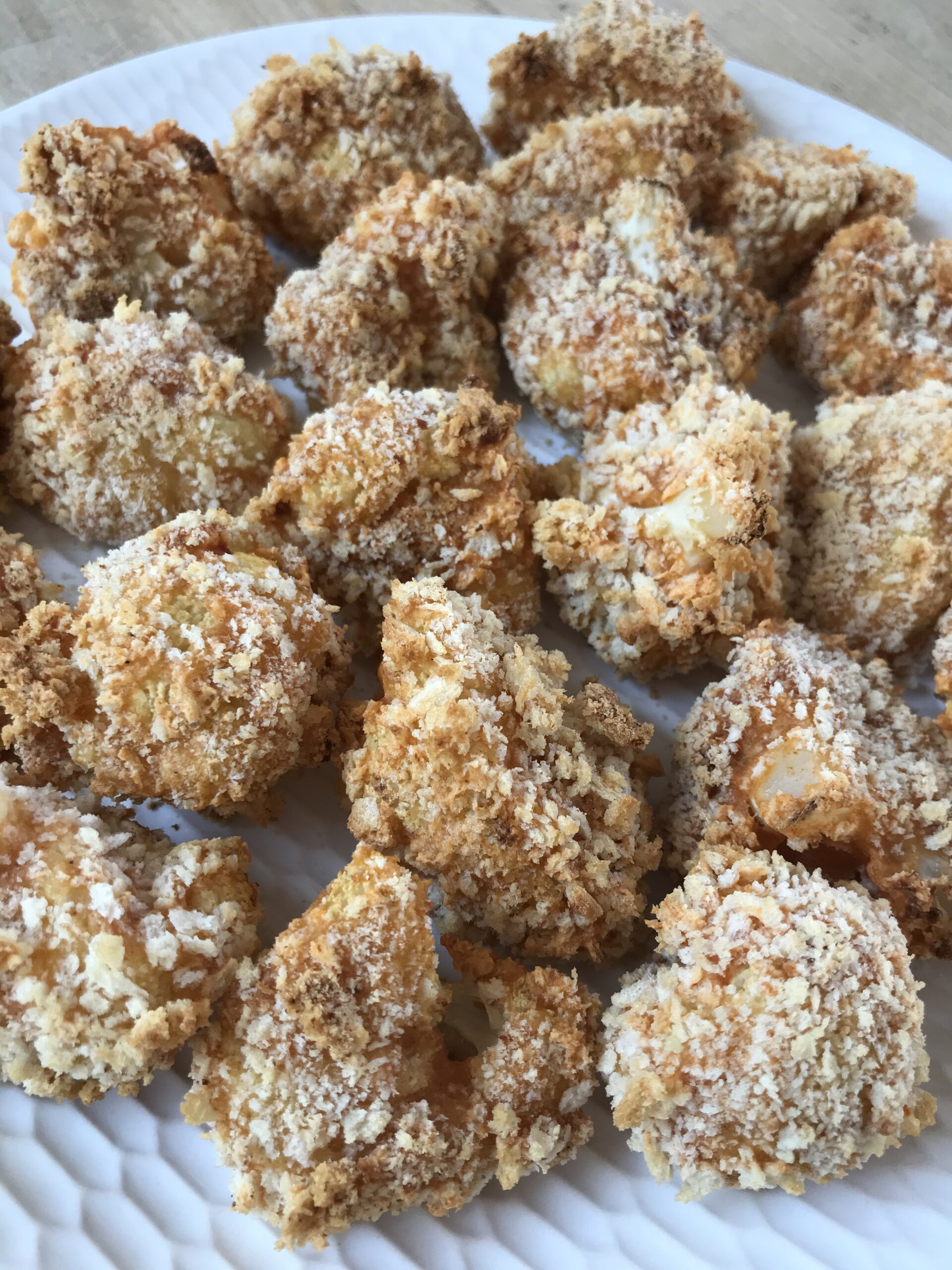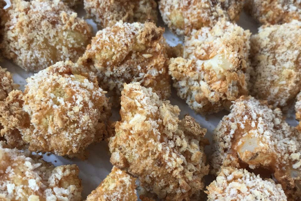 Blumenkohl in mundgerechte Röschen teilen, aus Mehl und Wasser einen zähflüssigen Teig anrühren und diesen kräftig würzen. Panko in einen tiefen Teller geben. Die Röschen in den Teig tauchen und in Panko wälzen – auf ein mit Backpapier ausgelegtes blech legen und bei 175 Grad Umluft 20-25 Minuten backen.