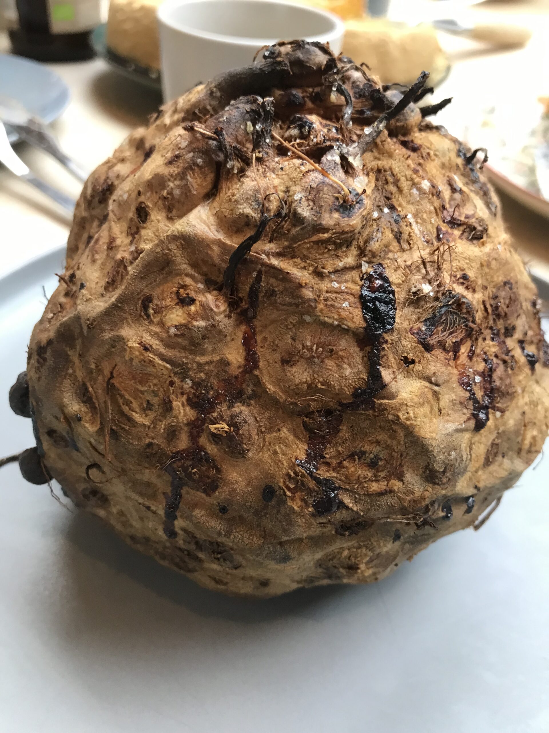 Die Knolle sehr gründlich säubern, rundum mit Olivenöl einreiben und salzen. Auf ein mit Backpapier ausgelegtes Backblech geben und für drei (!) Stunden bei 180 Grad Umluft backen. Aufschneiden, mit etwas Olivenöl und Zitronensaft beträufeln und leicht salzen. Einfach und köstlich!