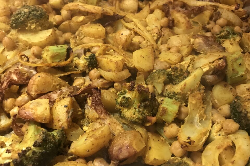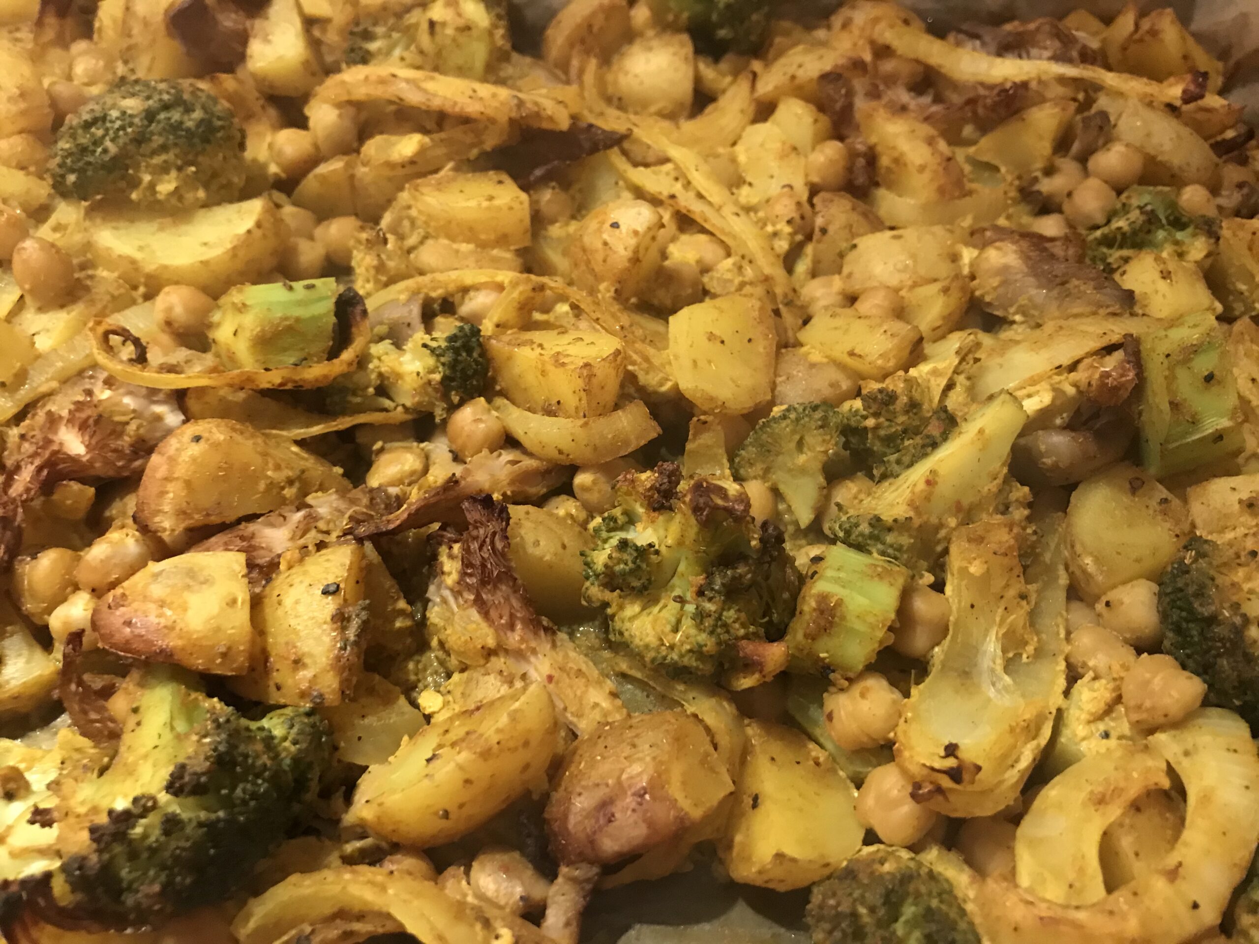 Brokkoli (auch den geschälten Strunk) und Kartoffeln (ungeschält) in Stücke schneiden, Zwiebel in Streifen. Etwa 300g Sojajoghurt mit Curry, Kreuzkümmel, Pfeffer und Salz mischen. Alles gut vermengen und auf ein mit Backpapier ausgelegtes Blech geben.