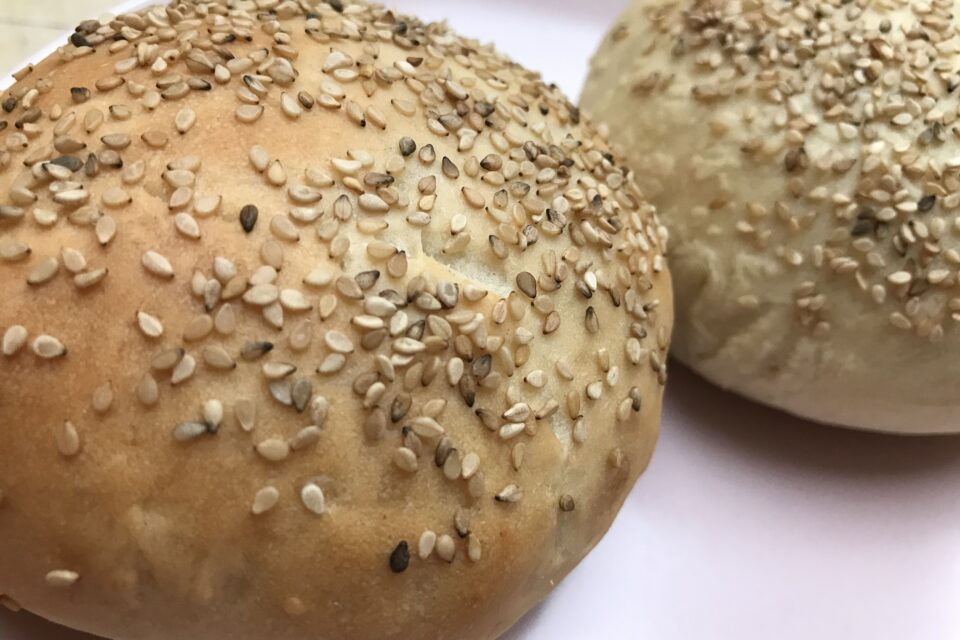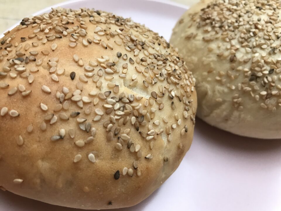 Mehl, Hefe, Salz und Zucker in einer Schüssel mischen. Die Margarine schmelzen und mit Hafermilch mischen (sollte dann alles lauwarm sein). Alles zehn Minuten miteinander verkneten. Den Teig zudecken und 1 h an einem warmen Ort gehen lassen. Vier Brötchen formen und mit einem angefeuchteten Geschirrtuch abgedeckt wieder 45 Minuten gehen lassen.. Mit etwas Hafermilch bestreichen und mit Sesam bestreuen. Bei 220 Grad Ober- und Unterhitze (vorgeheizt) ungefähr 15 Minuten backen.