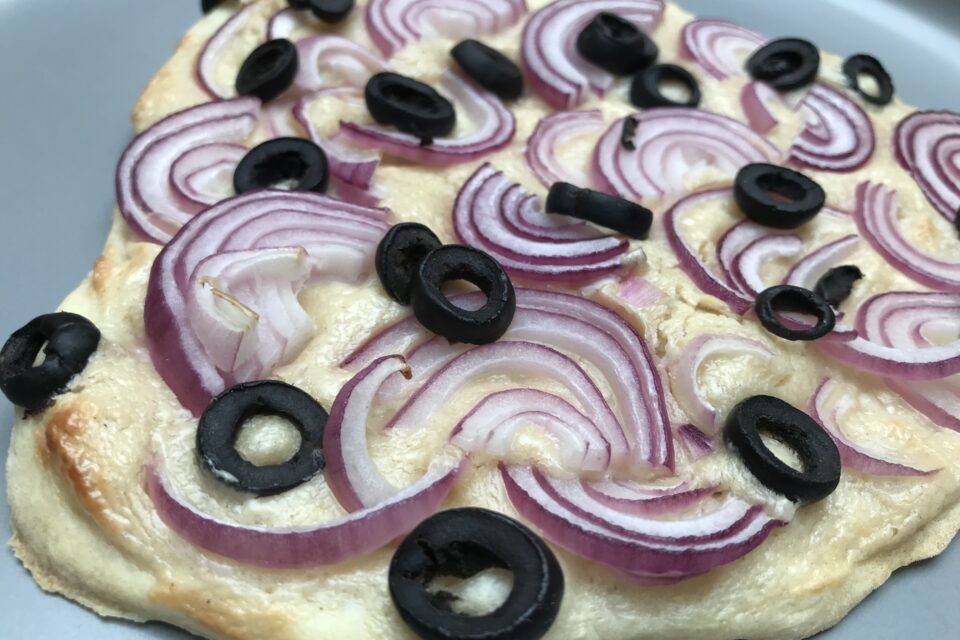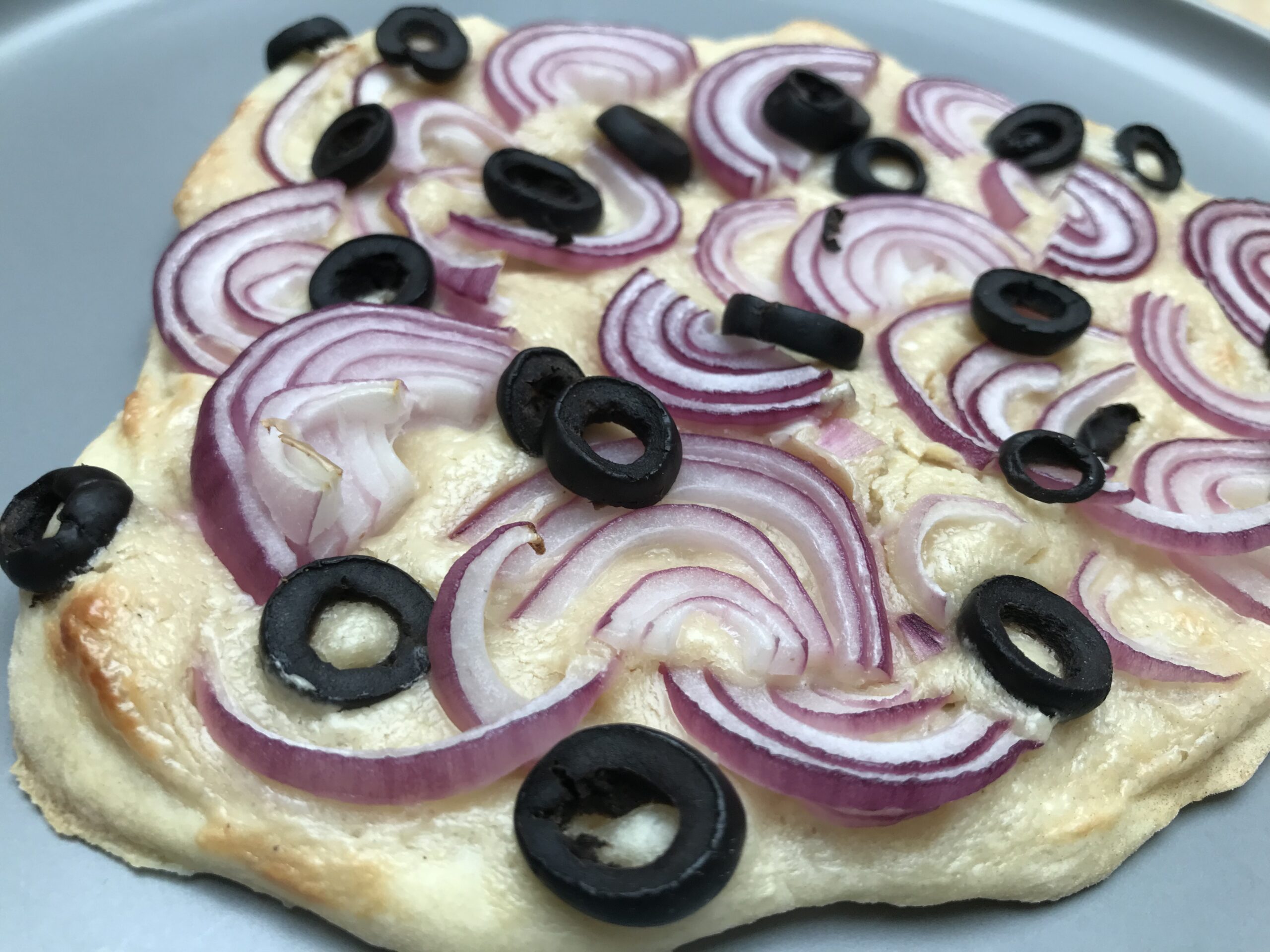 Alles 10 Minuten lang ordentlich kneten. Schüssel mit einem Tuch bedecken und an einem warmen Ort 1 Stunde gehen lassen. Mit etwas Olivenöl benetzen, in vier Teile teilen und jeweils sehr dünn ausrollen. Beim Belag sind der Phantasie keine Grenzen gesetzt. Aber auch ganz einfach ist toll: hier mit Cashewcreme, Olivenringen und Zwiebeln.