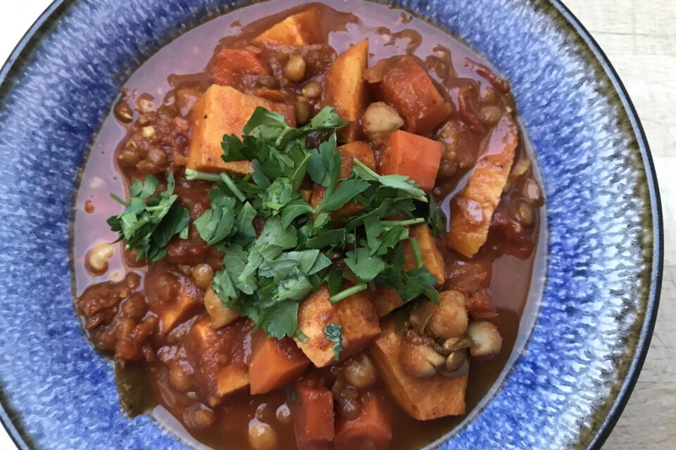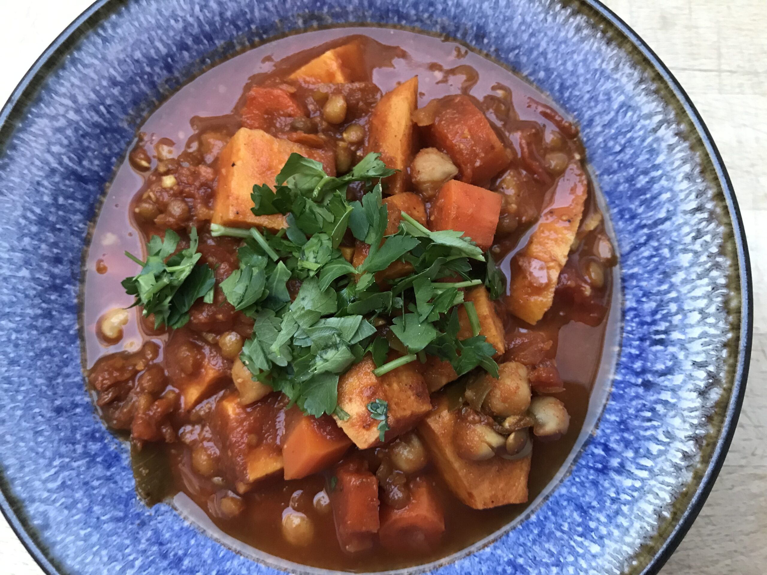 Zwiebel, Ingwer und Knoblauch schälen und sehr fein würfeln. In einem Topf reichlich neutrales Öl erhitzen und alles zusammen andünsten. Tomatenmark, Kreuzkümmel, Paprika und Ras el Hanout kurz mit anbraten. Die gewaschenen Linsen, Tomaten, Agavendicksaft und Gemüsebrühe zugeben und alles ca. 20 Minuten köcheln lassen.