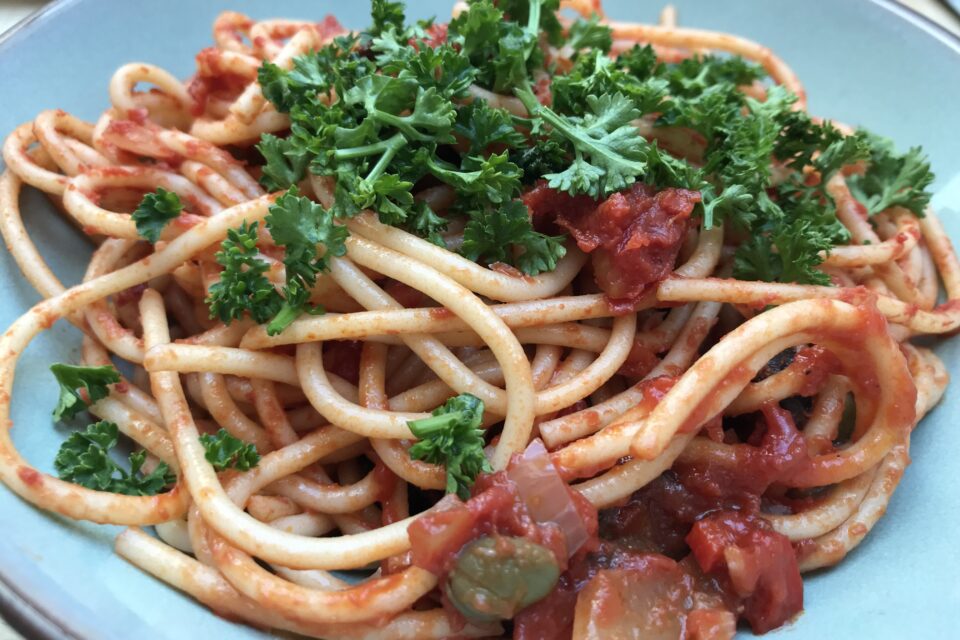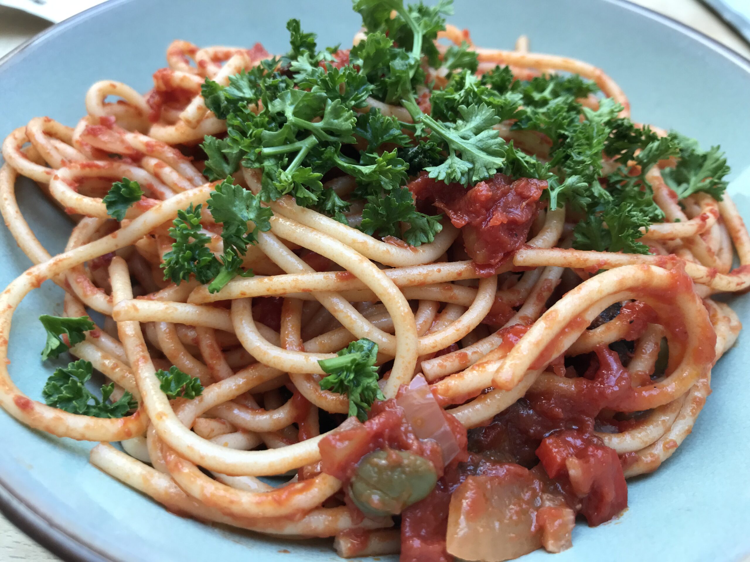Die kleingeschnittene Zwiebel in reichlich Olivenöl andünsten. Den fein gehackten Knoblauch und die fein gewürfelte Peperoni (entkernt) kurz mitbraten. Das Tomatenmark ebenfalls kurz mitanbraten und dann alles mit einem Schuss Rotwein ablöschen. Tomaten, in Scheiben geschnittene Oliven und abgespülte Kapern dazugeben und ca. 20 Minuten köcheln lassen. Mit Salz und Pfeffer abschmecken. Parallel die Spaghetti kochen. Die fertigen, gut abgetropften Spaghetti mit der Soße vermischen und mit Petersilie bestreut servieren.