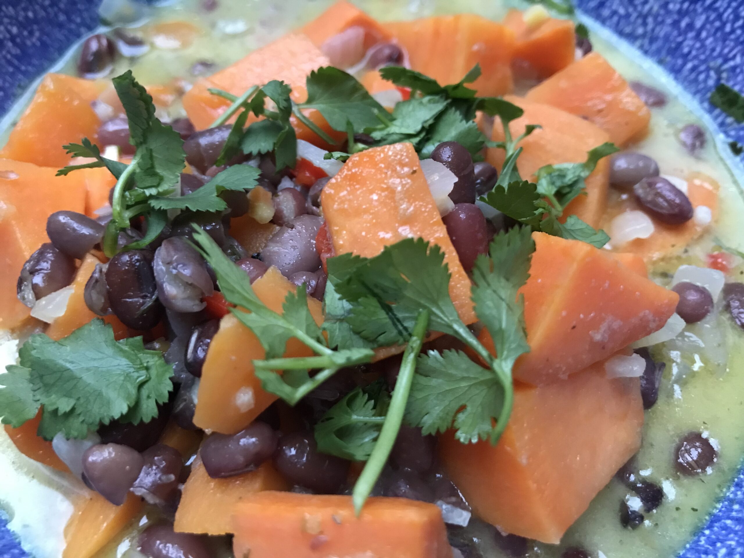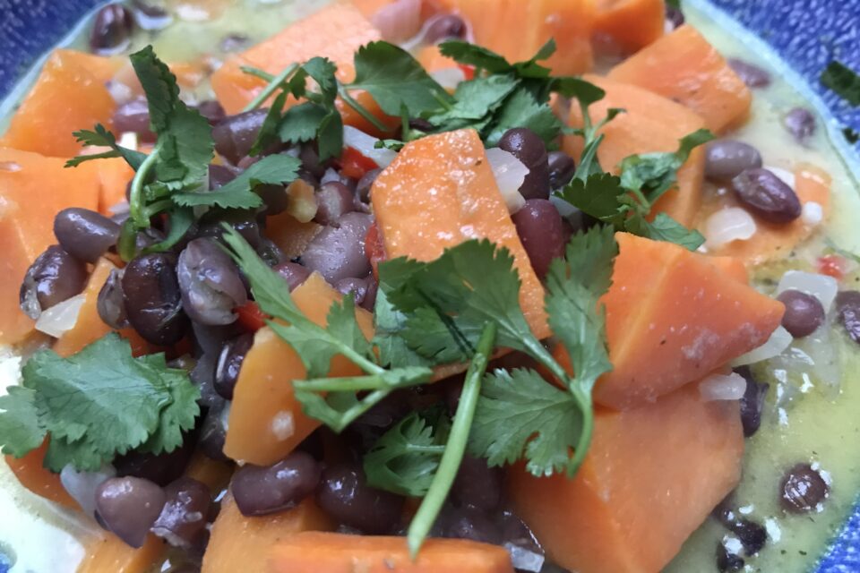 Zwiebel kleinschneiden und andünsten. Kleingehackten Knoblauch, Chili und Ingwer zugeben – mit Kokosmilch ablöschen und noch etwas Gemüsebrühe dazugießen (ca. 100ml). Etwa 10 Minuten köcheln lassen. Die Süßkartoffel schälen und in ca 1cm -Würfel schneiden. Die Bohnen und die Süßkartoffelwürfel zugeben und etwa fünf Minuten mitköcheln- nur bis die Süßkartoffeln weich sind. Mit Salz und Pfeffer abschmecken. Den Saft einer halben Limette unterrühren.