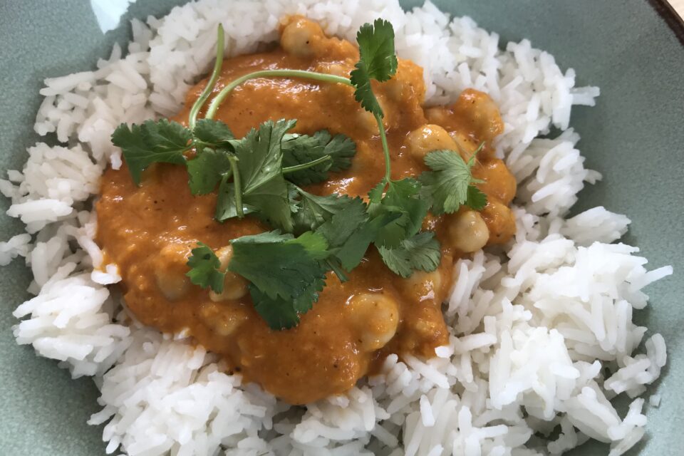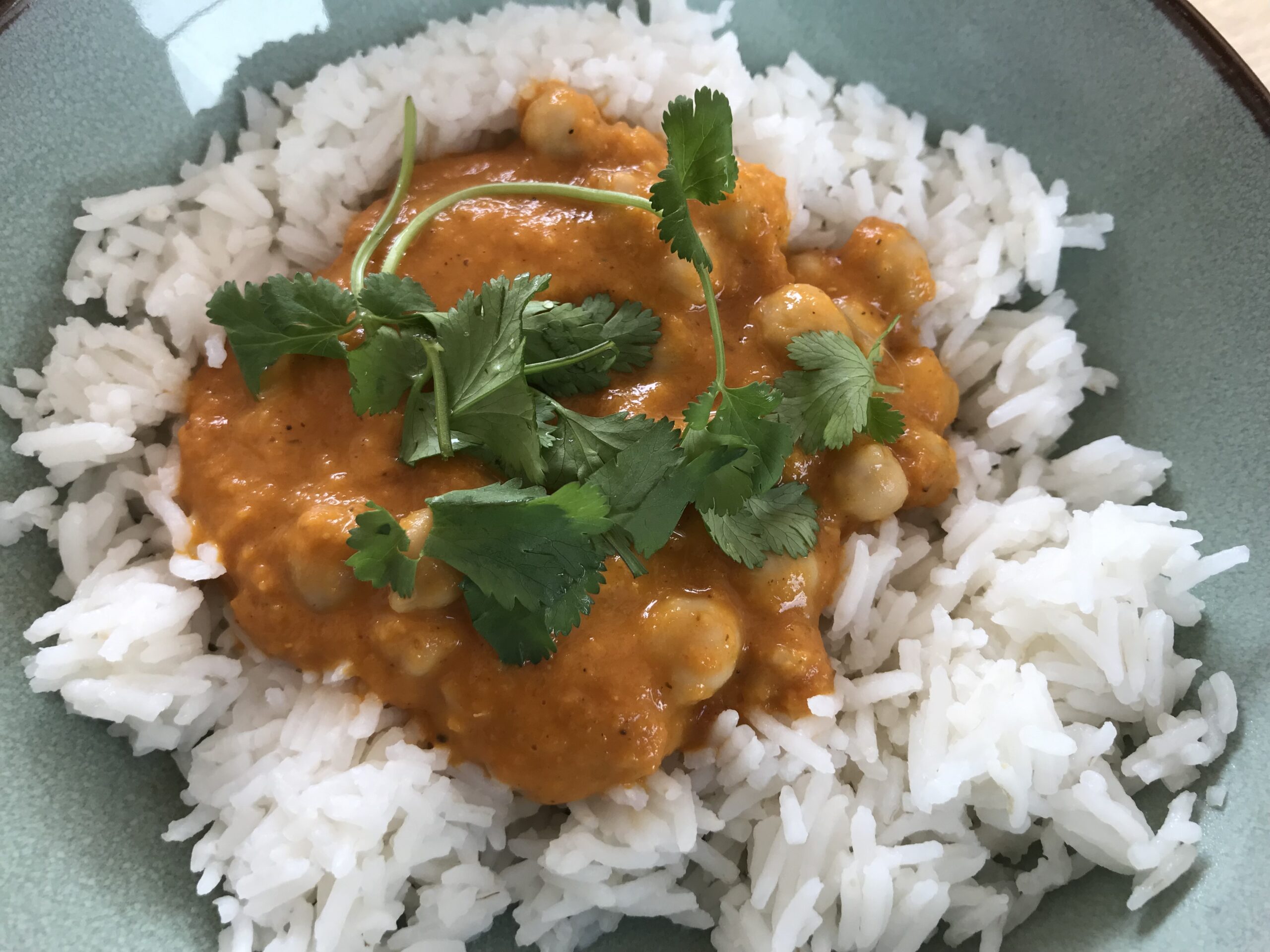 Zwiebel, Knoblauch, Ingwer und Mango kleinschneiden. Zuerst die Zwiebel andünsten. Dann Knoblauch und Ingwer, sowie Curry und Kreuzkümmel zugeben. Kurz mitbraten und mit der Kokosmilch und den Tomaten ablöschen. Mit Pfeffer, Salz und Chili würzen und etwa 10 Minuten köcheln. Kichererbsen und Mangostücke, sowie Garam Masala zugeben (oder alles bis auf die Kichererbsen pürieren- gut, wenn Kinder mitessen…).Nur noch ein paar Minuten köcheln und auf Reis mit Koriander bestreut servieren.