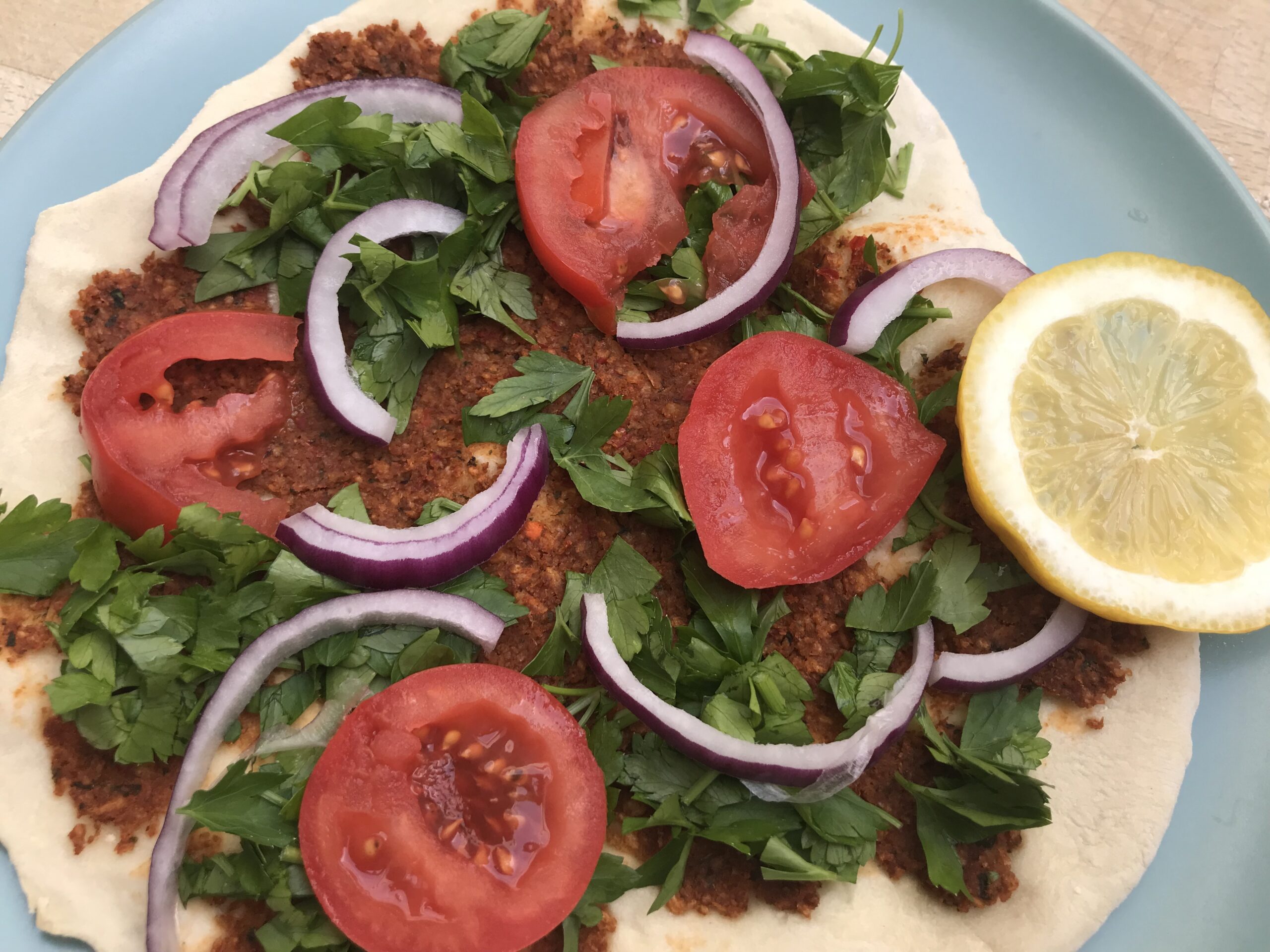 Den Teig zu dünnen Fladen ausrollen und mit dem Belag bestreichen. Etwa 10-15 Minuten bei 225 Grad Ober- und Unterhitze backen. Mit Zitronensaft beträufeln, mit Tomaten, Zwiebeln und Petersilie belegen- aufrollen und genießen!