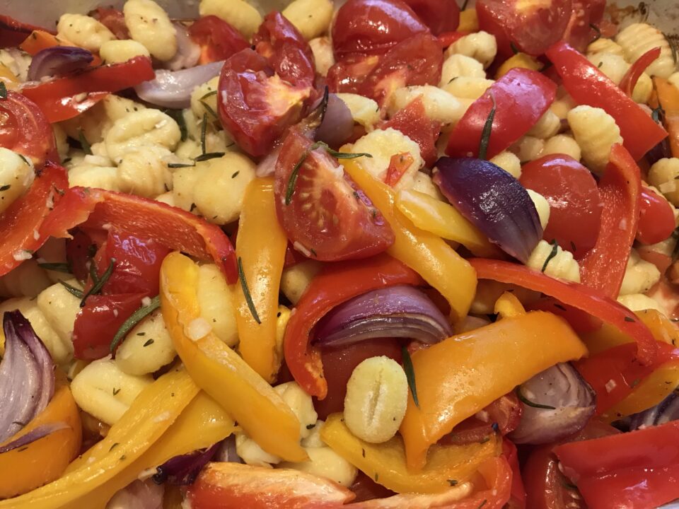 Die Zubereitung ist denkbar einfach: ein Blech mit Backpapier auslegen. Paprikas putzen und in mundgerechte Stücke schneiden. Zwiebel schälen und in Scheiben schneiden. Den Knoblauchschälen und fein hacken. Die Tomaten halbieren. Alles zusammen mit den Gnocchi aufs Blech geben. Salzen, pfeffern und mit dem Olivenöl beträufeln. Die Zweige dazugeben und alles mischen (eigentlich soll man die Nadeln bzw. Blättchen abzupfen und fein hacken- ich finde, es funktioniert auch , wenn man einfach die ganzen Zweige mitbackt und hinterher rausfischt..)