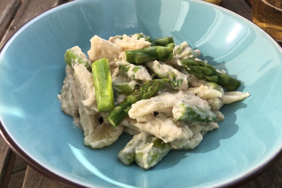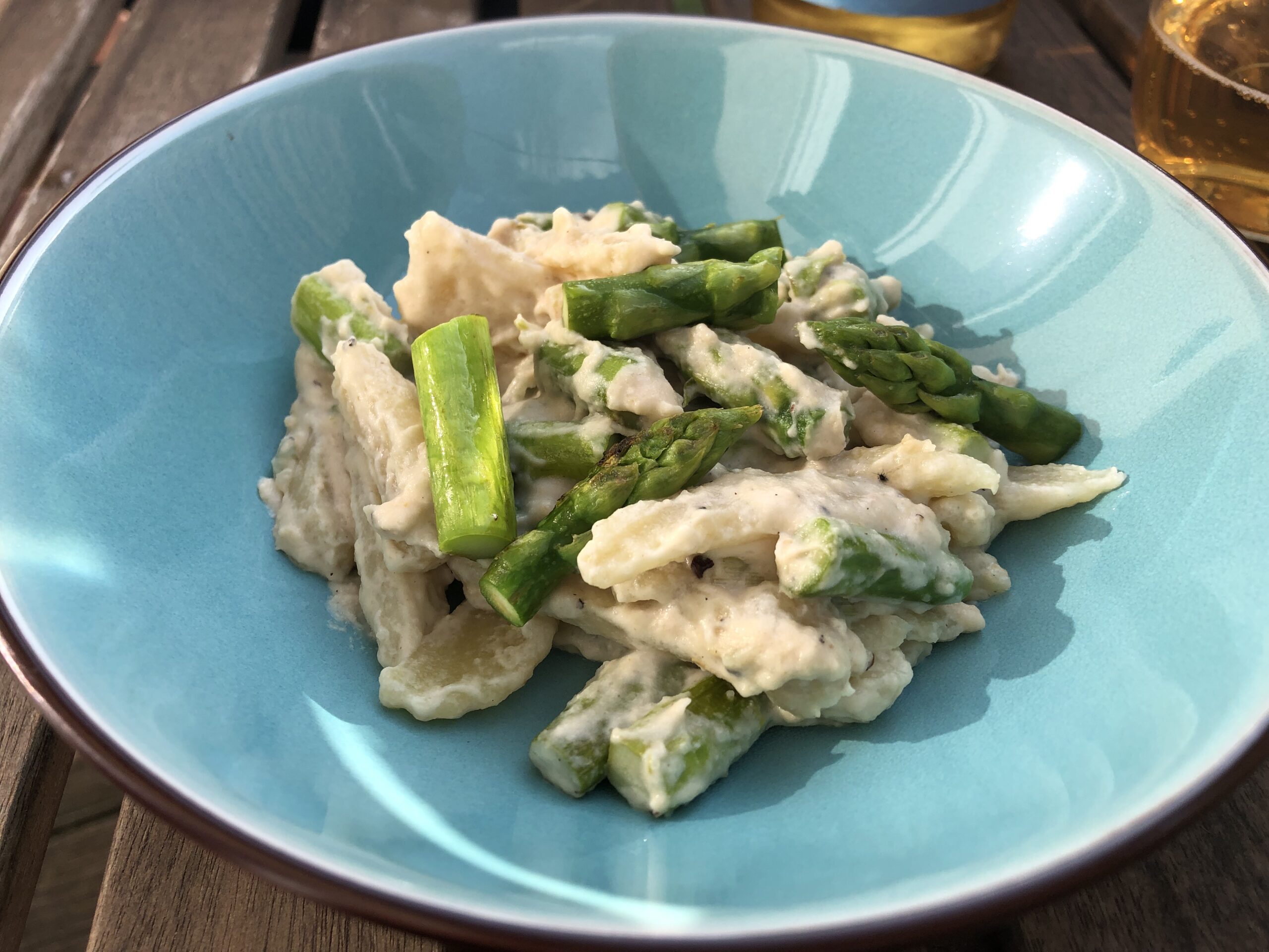 Spargel putzen und in ca 2cm lange Stücke schneiden. In etwas Olivenöl braten bis er gar, aber noch bissfest ist (8-10 Minuten). Parallel dazu die Nudeln aufsetzen. Zum Spargel Cashewcreme, Hefeflocken, Knoblauch und Zitrone geben. Mit Pfeffer und Salz abschmecken. Etwas Nudelwasser abschöpfen, Nudeln abgießen und direkt mit dem Spargel vermengen. Soviel Pastawasser zugeben, dass eine cremige Konsistenz entsteht.