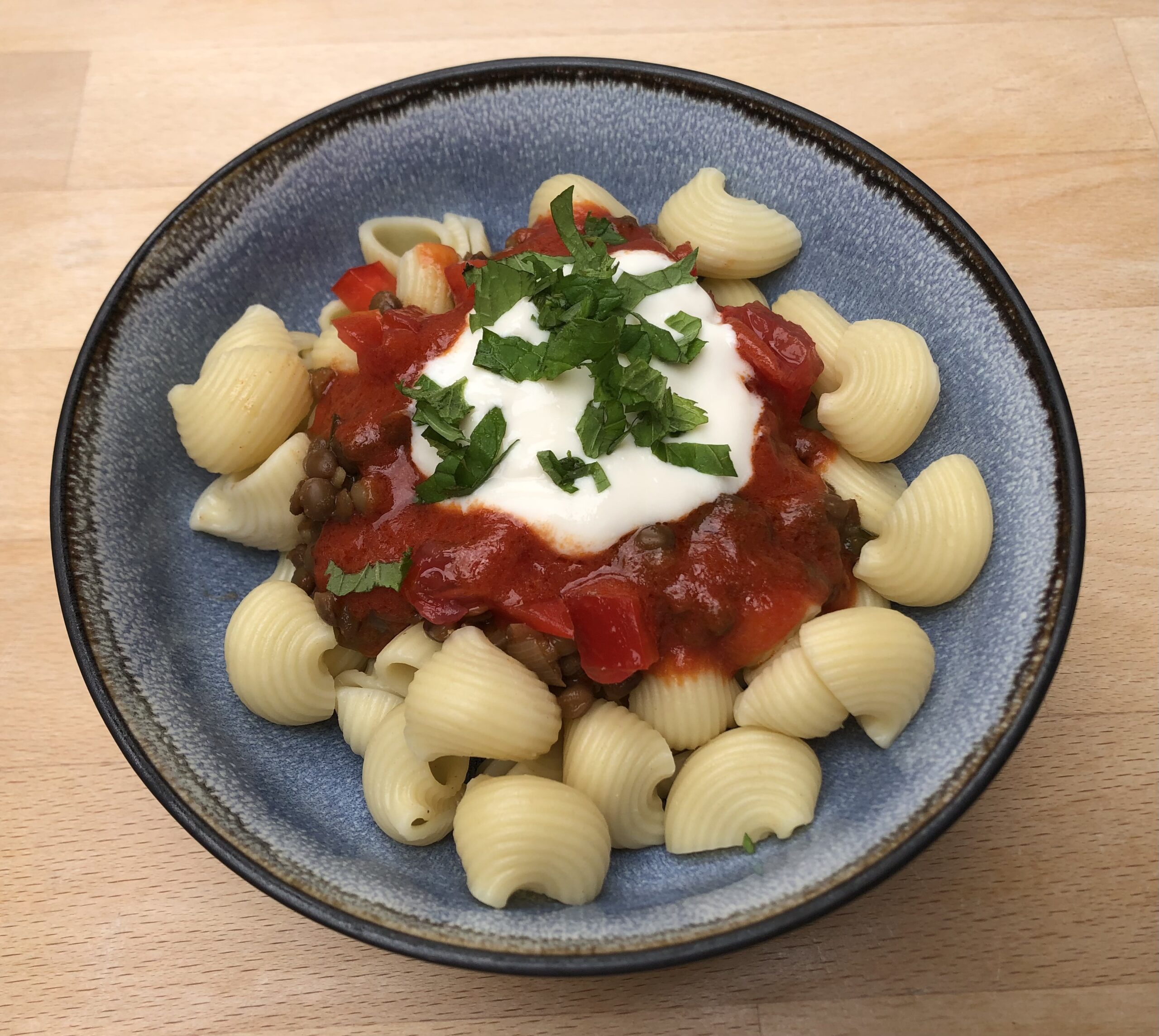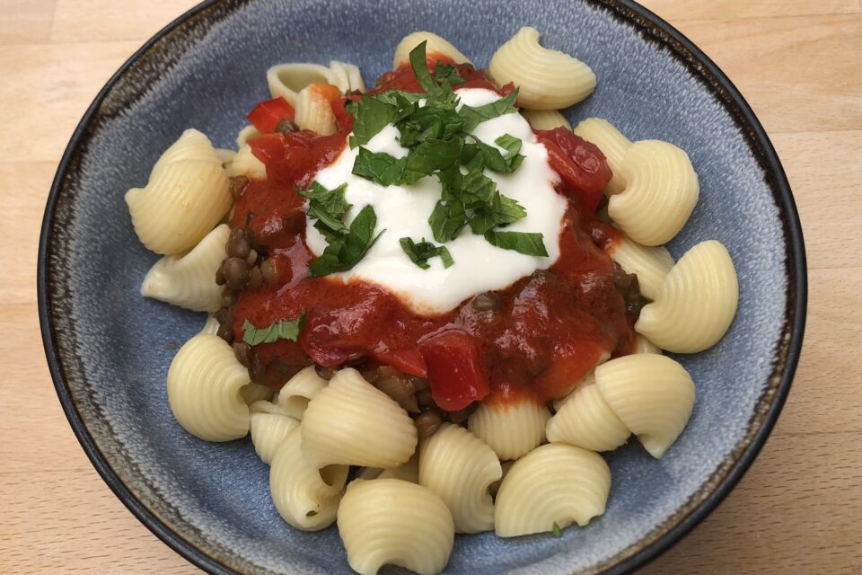 Manti sind türkische Teigtaschen mit Fleisch- oder Linsenfüllung- dazu Joghurtsoße und Paprikabutter. Dieses Rezept ist ein bisschen davon inspiriert. Statt Teigtaschen gibt es einfach Nudeln mit Linsensoße, dazu Tomaten-Paprika – Margarine und Sojajoghurt.