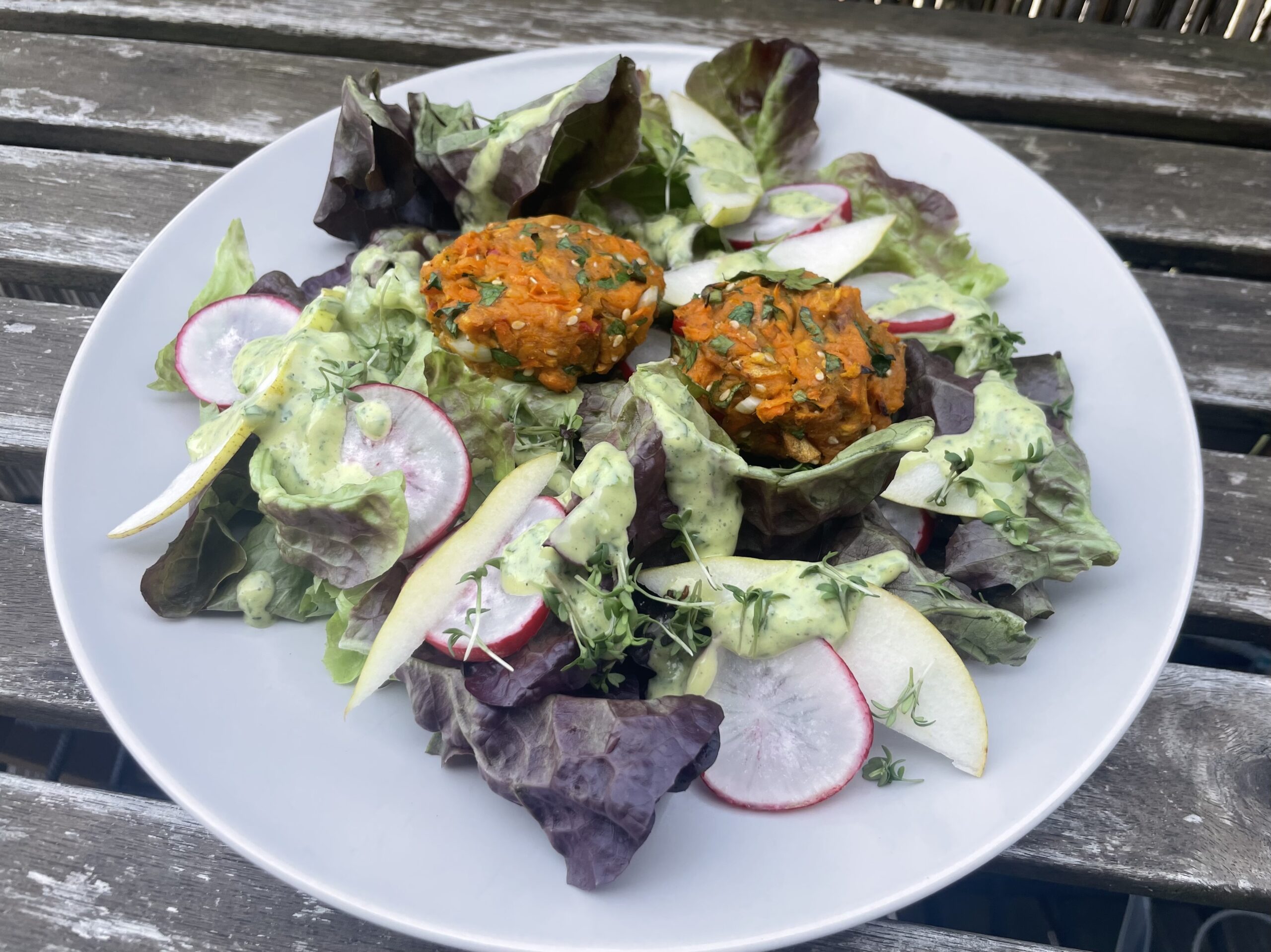 Salat mit Radieschen und Birnen anrichten, Dressing darüber träufeln, mit Kresse garnieren und Süßkartoffel- Puffer darauf legen.