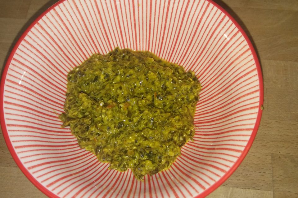 Mangoldblätter (ohne Stiel) blanchieren und grob zerkleinern, mit den anderen Zutaten zusammen pürieren