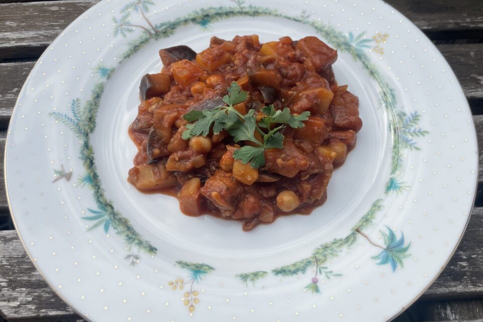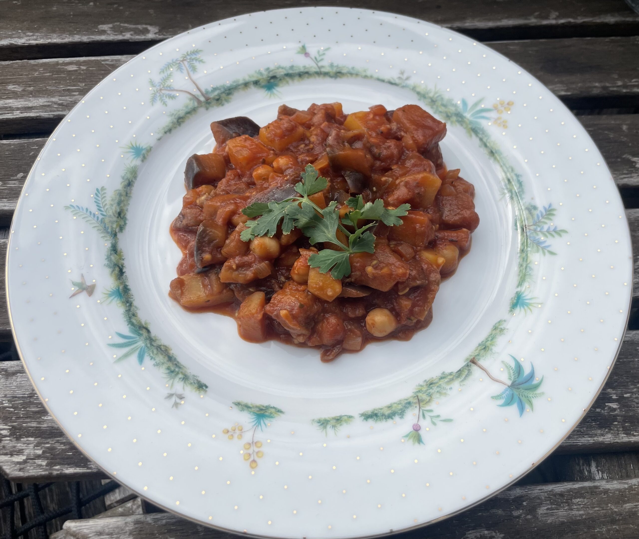 Viel Olivenöl in einem Topf ordentlich erhitzen. Auberginen und Kartoffeln zugeben und bei kleiner Hitze und geschlossenem Deckel etwa 10 Minuten schmoren (immer mal wieder rühren!). Zwiebel und Knoblauch zugeben und weitere 5 Minuten garen. Nun die restlichen Zutaten unterrühren und ca. 20 Minuten bei kleiner Hitze weiterschmoren bis alles weich ist.