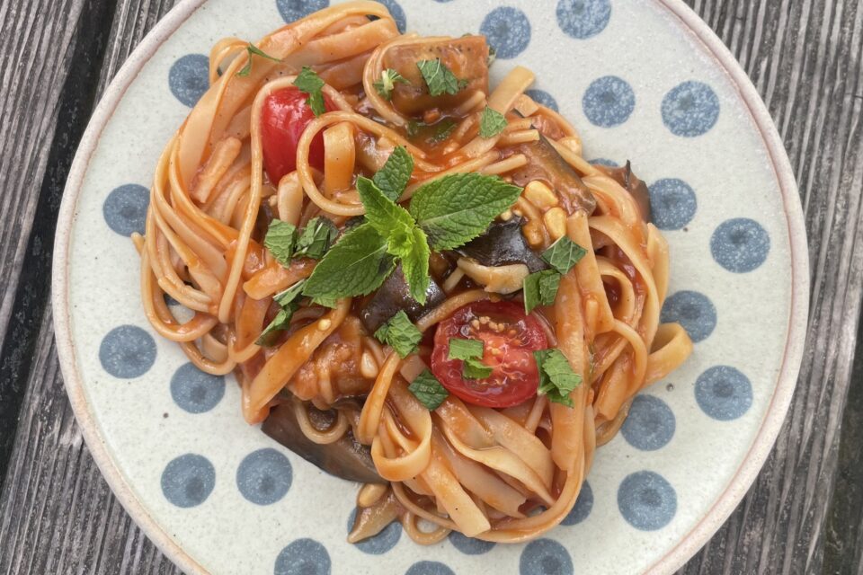 Viel Olivenöl in einem großen Topf erhitzen. Die gewürfelten Auberginen 10 Minuten andünsten. Klein gewürfelte Zwiebel, gehackten Knoblauch und Pinienkerne dazugeben und weitere 5 Minuten anbraten. Alle übrigen Zutaten bis auf die Minze und die Tomaten zugeben und bei geschlossenem Deckel ca. 15 Minuten köcheln. Immer mal wieder umrühren. Die Minzblättchen fein schneiden. Einen Teil kurz vor Ende der Garzeit dazugeben. Die Kirschtomaten halbieren und ebenfalls kurz mit erwärmen. Beim Servieren frische Minze darüberstreuen.