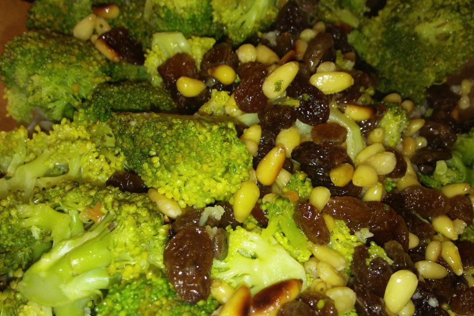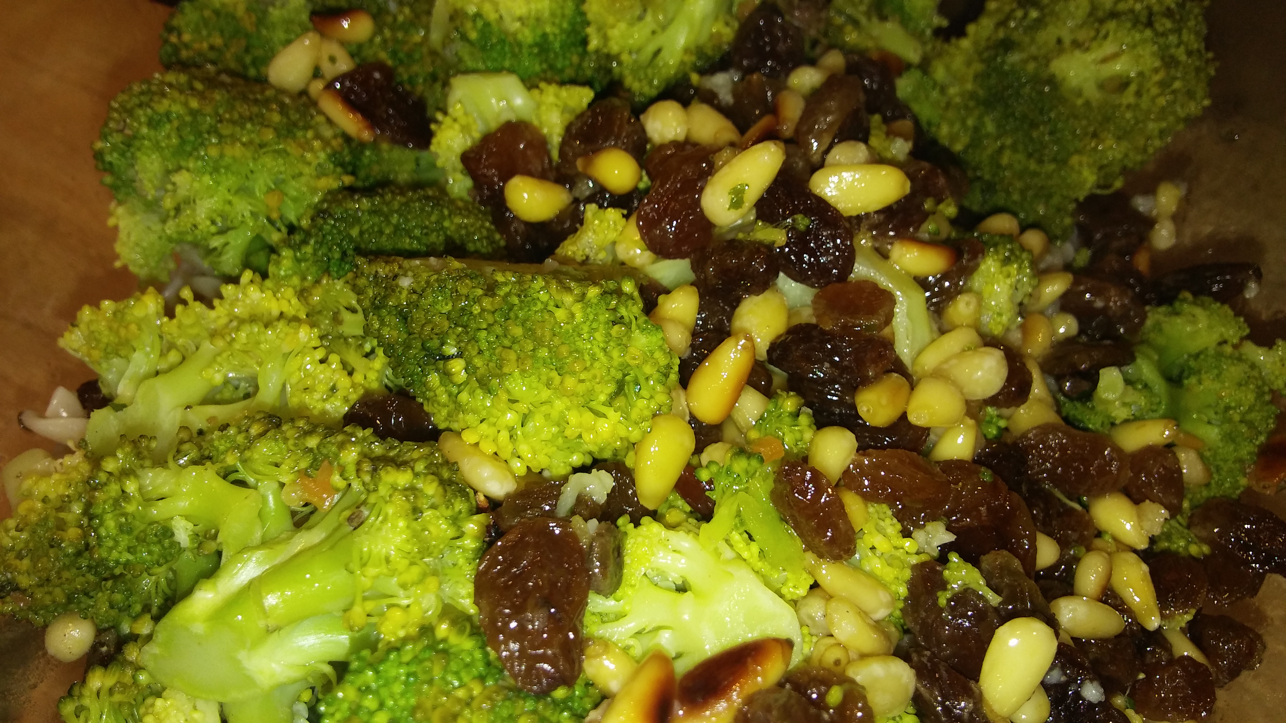 Brokkoli putzen, in kleine Röschen zerteilen und in Gemüsebrühe bissfest kochen (ca. 5 Minuten). Nudeln aufsetzen und in der Zwischenzeit Knoblauch sehr fein hacken und mit Salz vermischen (ich benutze dafür einen Mörser). In einer Pfanne zuerst die Pinienkerne rösten dann reichlich Olivenöl zugeben. Brokkoli, Knoblauch-Salz- Gemisch, Pfeffer und Rosinen zugeben und alles verrühren . Nudeln abgießen und sofort mit dem Pfanneninhalt vermischen. Am besten nochmal reichlich Olivenöl zugeben.