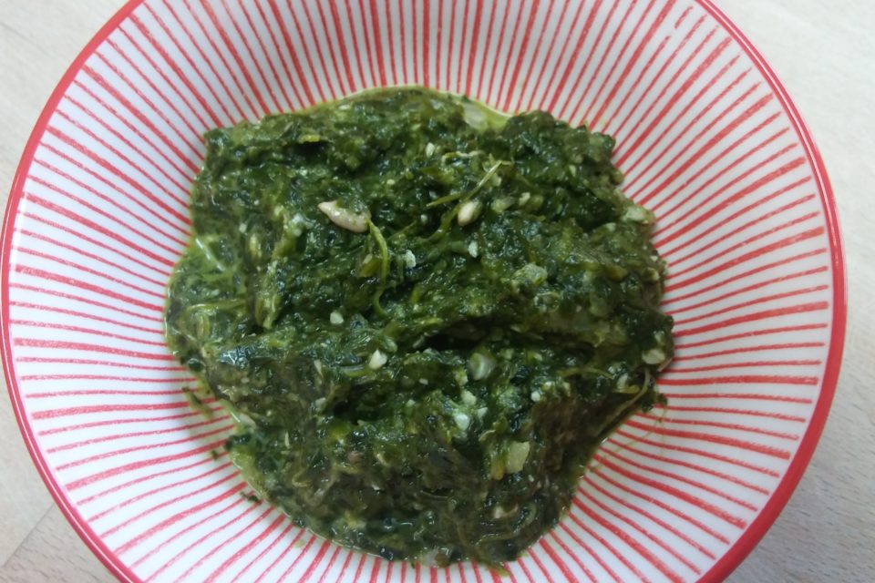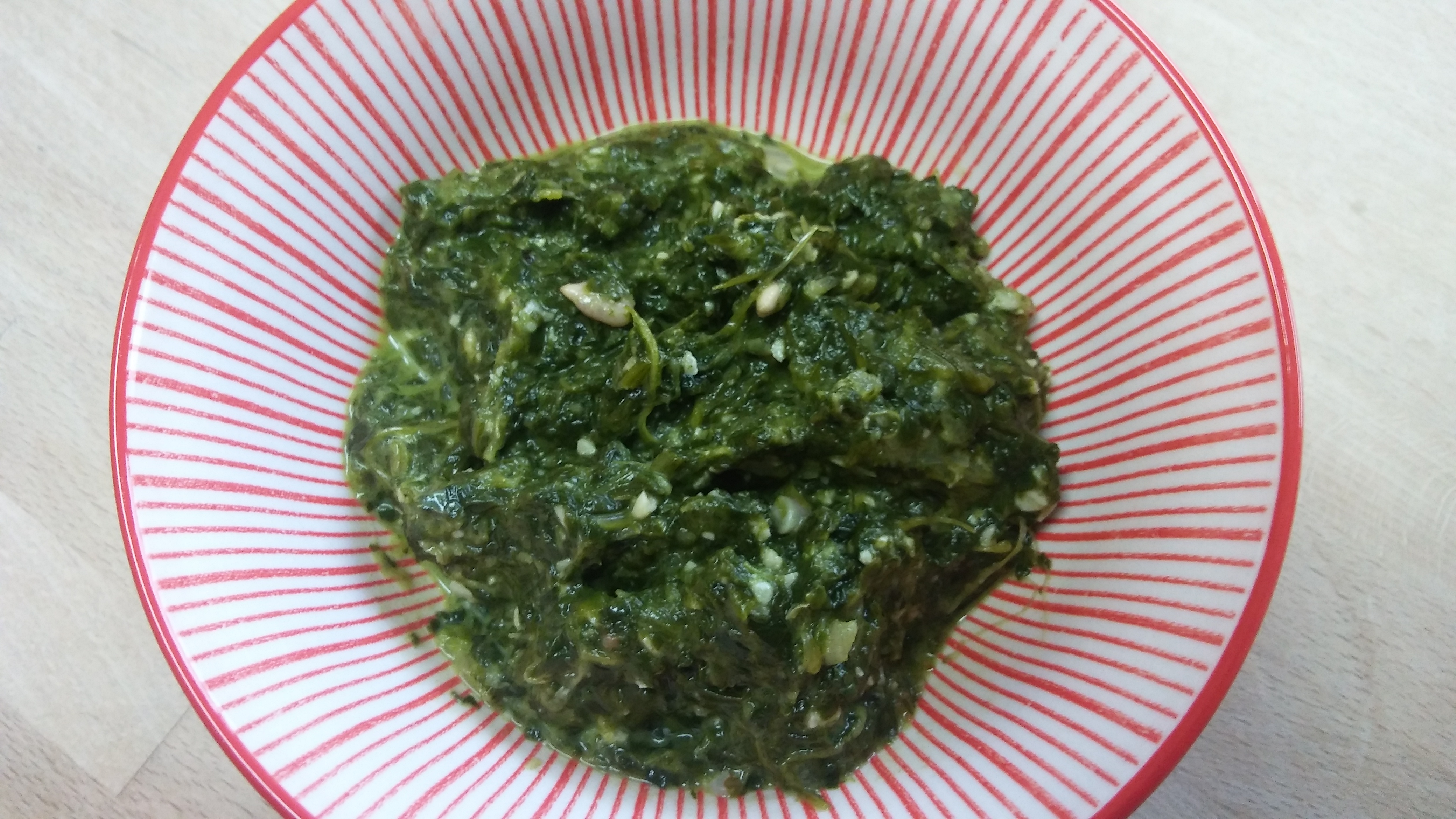 Die klein gewürfelte Zwiebel in reichlich Olivenöl andünsten, Knoblauch und Spinat zugeben, würzen. Am Ende den Weißweinessig und die Pinienkerne unterrühren – alles grob pürieren.