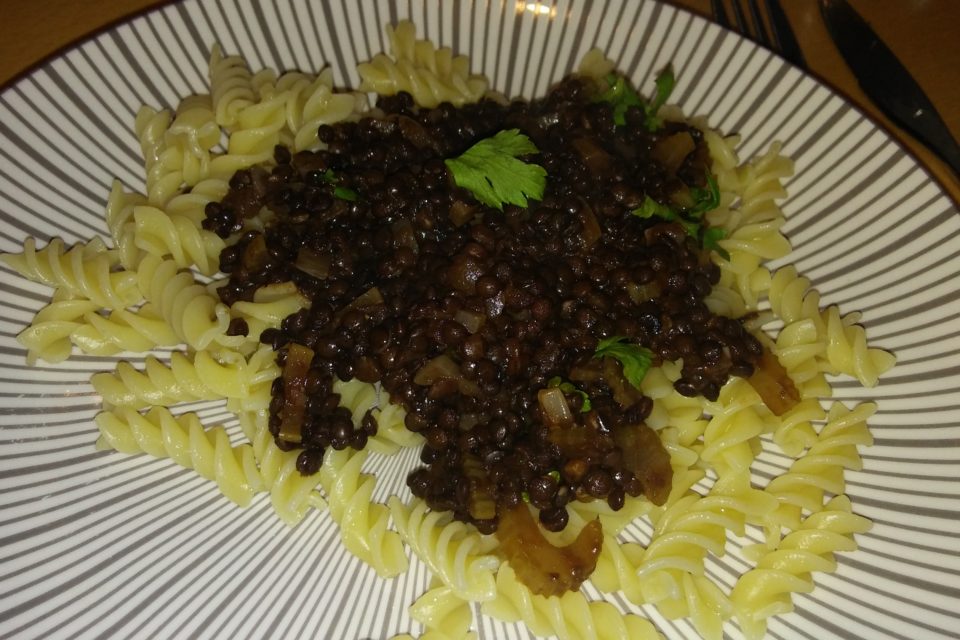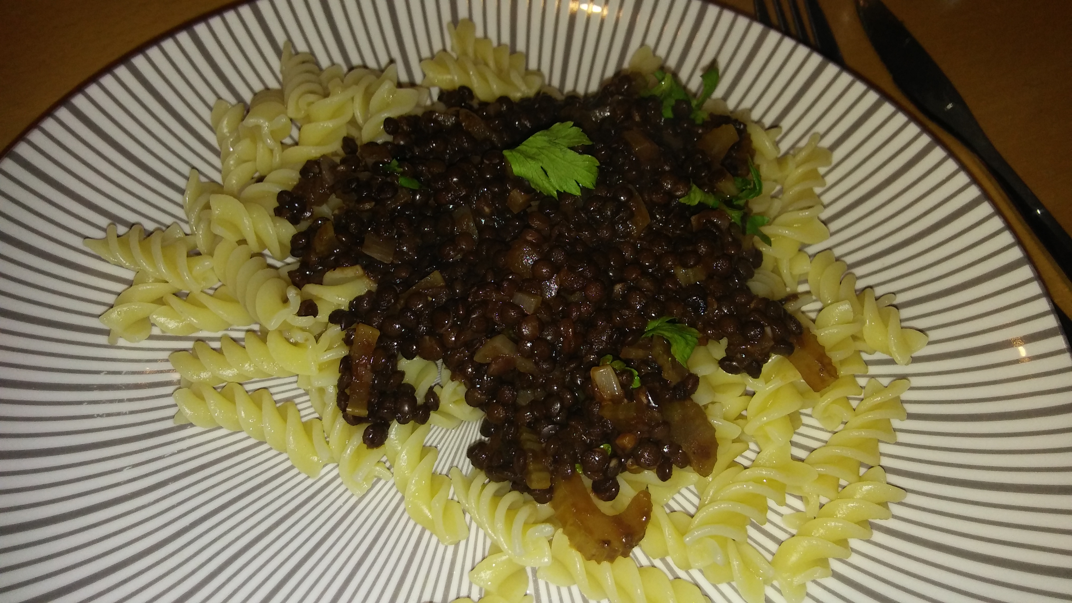 Zwiebel und Sellerie in reichlich Olivenöl andünsten. Tomatenmark zugeben und mit Balsamico ablöschen. Sobald der Essig verkocht ist die gegarten Linsen zugeben- eventuell auch etwas Wasser.