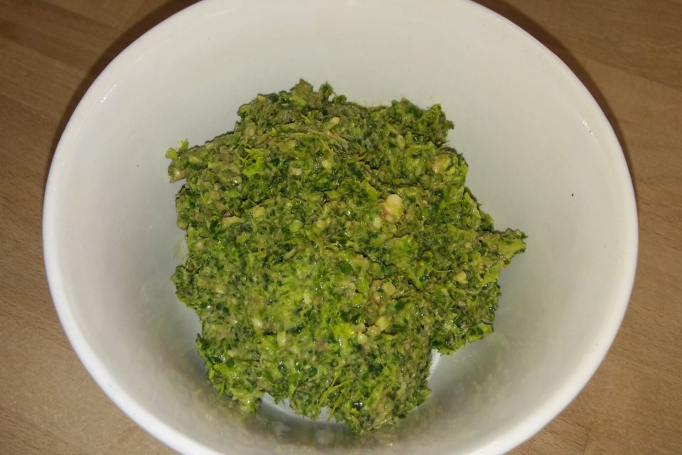 Die Wirsingblätter gründlich waschen, den Strunk entfernen und klein rupfen. Knoblauch schälen und grob zerkleinern. Alle zutaten zusammen fein pürieren.