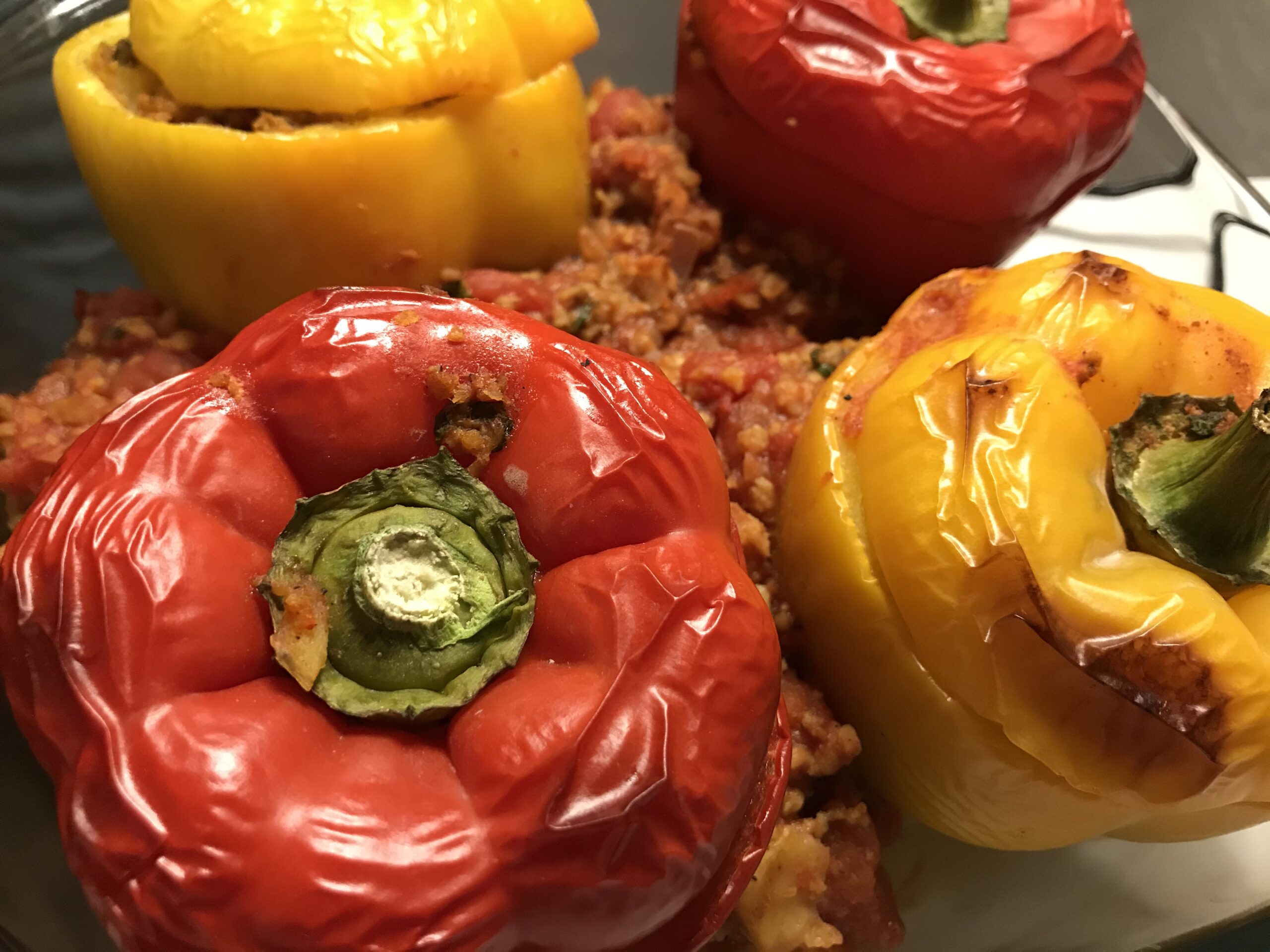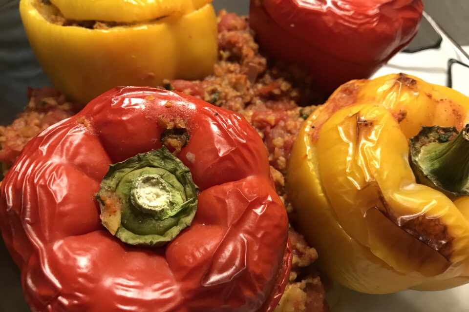 Die Masse in die Paprikaschoten füllen und diese in eine Auflaufform setzen. Aus der restlichen masse mit den gehackten Tomaten eine dickflüssige Soße anrühren.