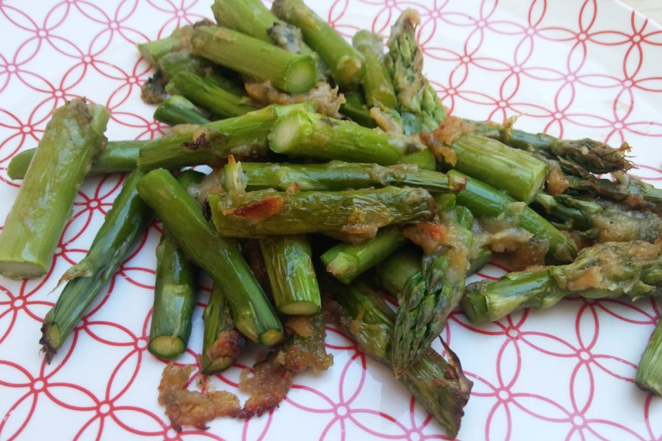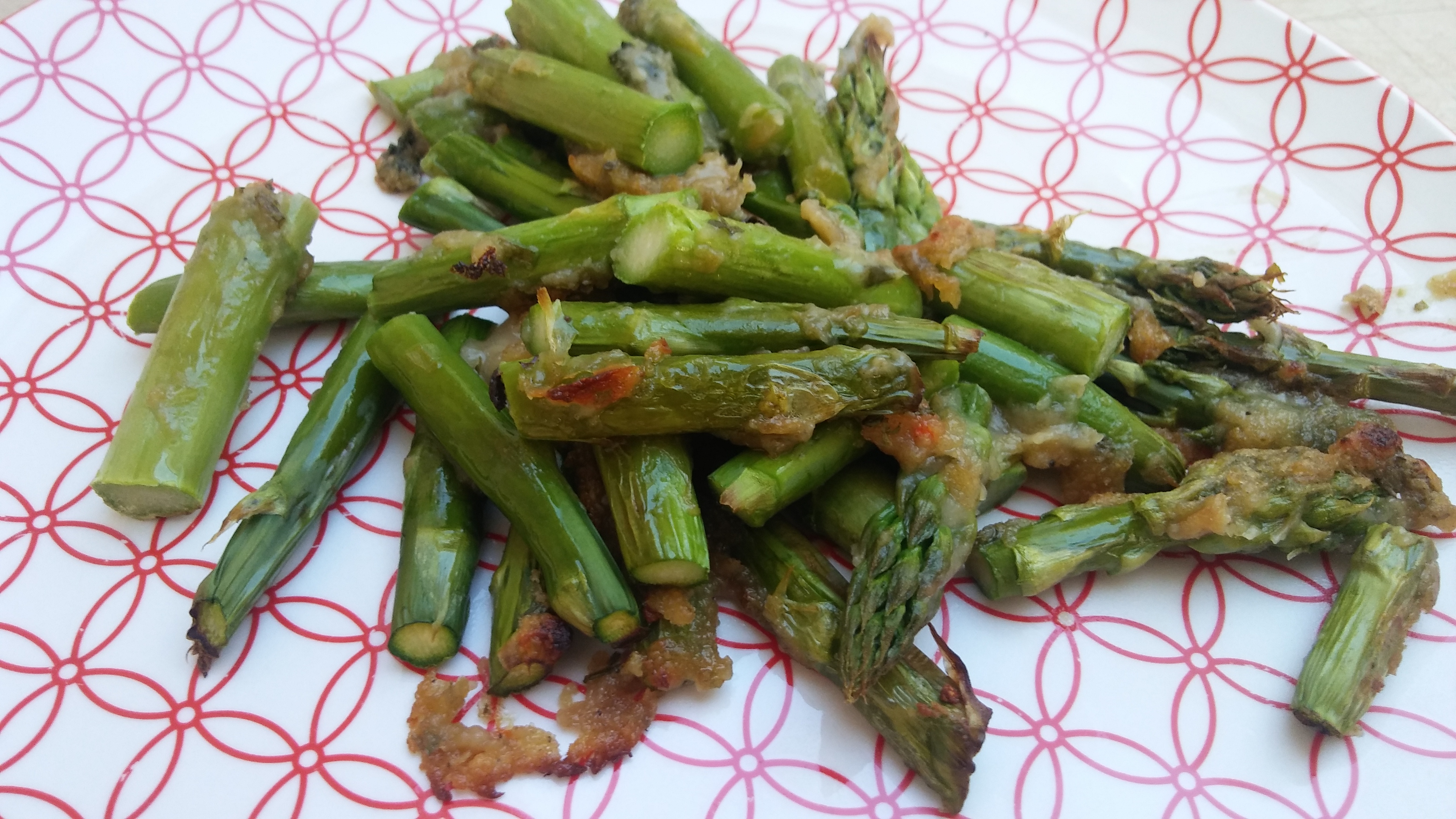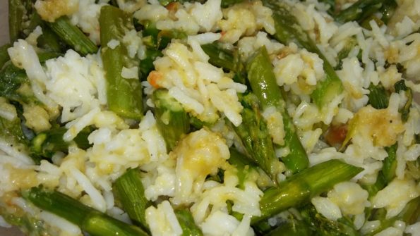 Den Spargel putzen, in mundgerechte Stücke schneiden und auf Backpapier ausbreiten. Etwas Mandelmusaufstrich daraufgeben und bei 180 Grad (Umluft) ca 15-20 Minuten backen. Währenddessen den Reis kochen und das Dressing anrühren. Wenn der Spargel gar ist, alles miteinander vermischen. Schmeckt auch kalt!