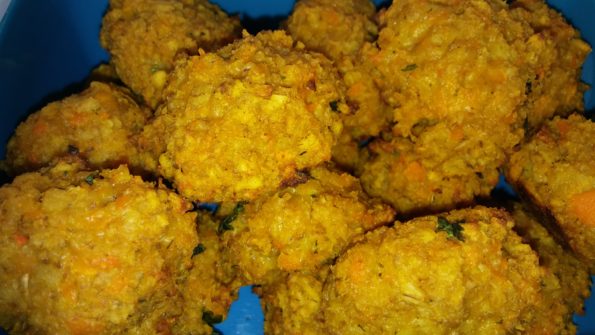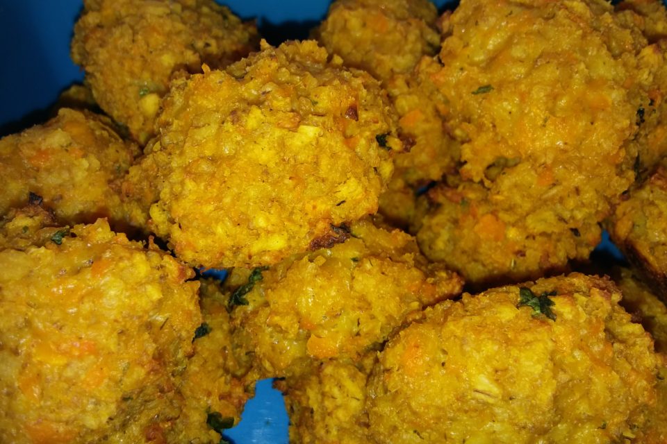 Haferflocken in Gemüsebrühe einweichen, Zwiebel fein würfeln und andünsten. Möhren schälen und grob raspeln. Alles zusammenmischen und aus der Masse Bällchen formen. Auf ein mit Backpapier ausgelegtes Blech legen und bei 180 Grad Umluft ca. 20 Minuten backen bis sie schön knusprig sind.