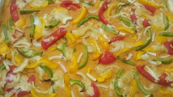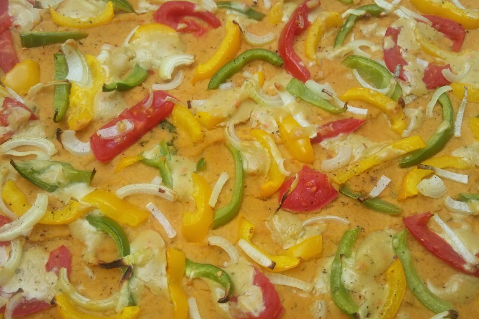 Den Teig mit der Kicherbsencreme dick bestreichen. Kleingeschnittene Paprund, Tomate und Tomate darauf verteilen. Mit Mandelmusaufstrich verzieren und bei 180 Grad Umluft ca. 20 Minuten backen. In mundgerechte Stücke schneiden.