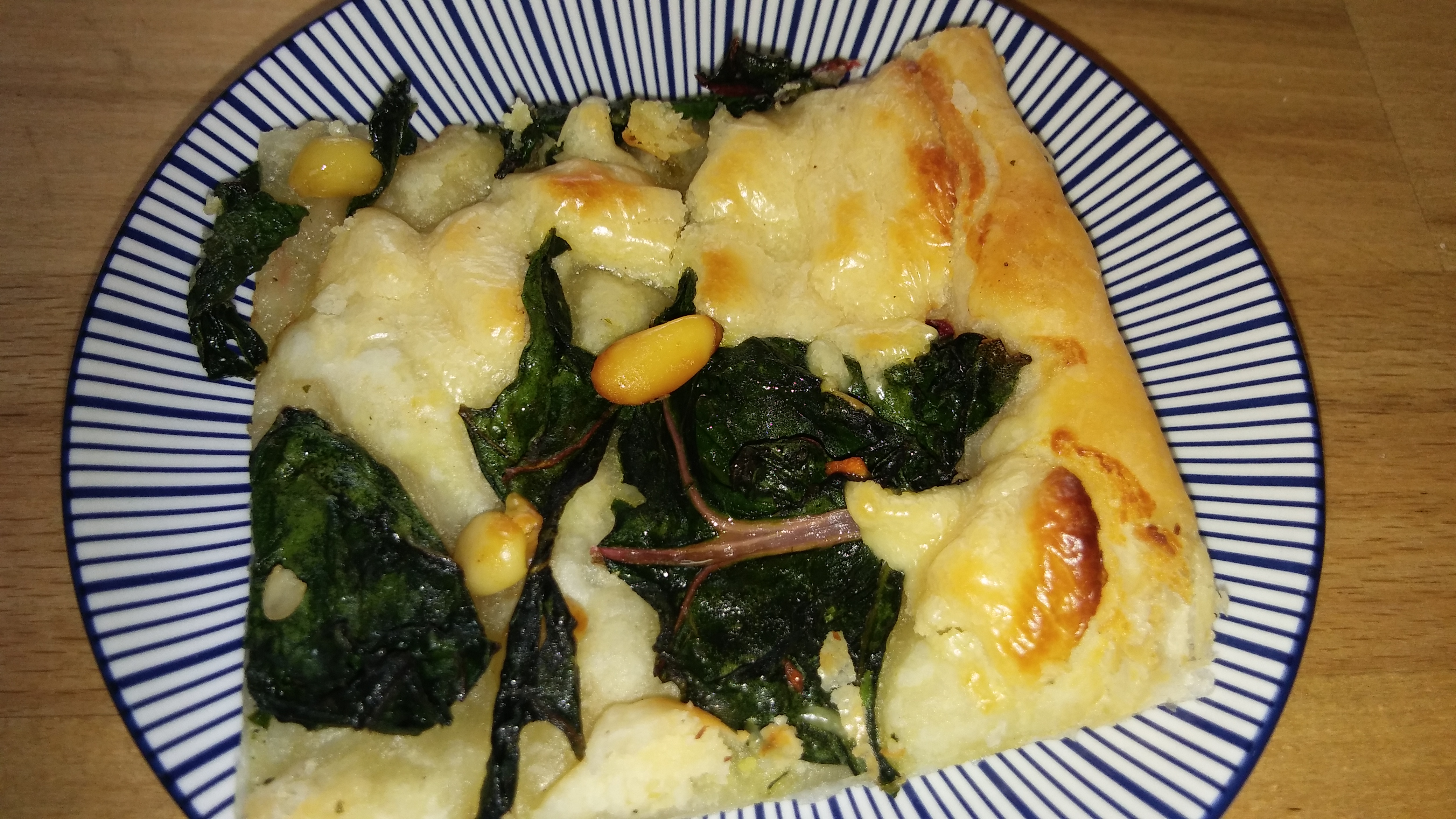 Blätterteig auf ein Backblech legen. Mangold, Creme und Pinienkerne darauf verteilen. Bei 180 Grad Umluft ca. 20-25 Minuten backen.