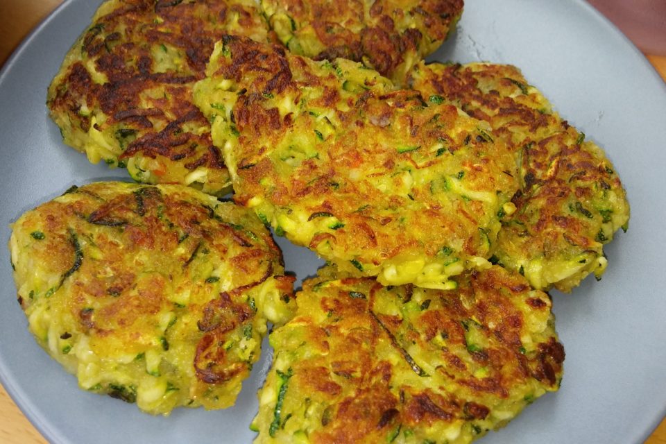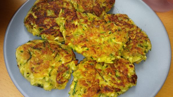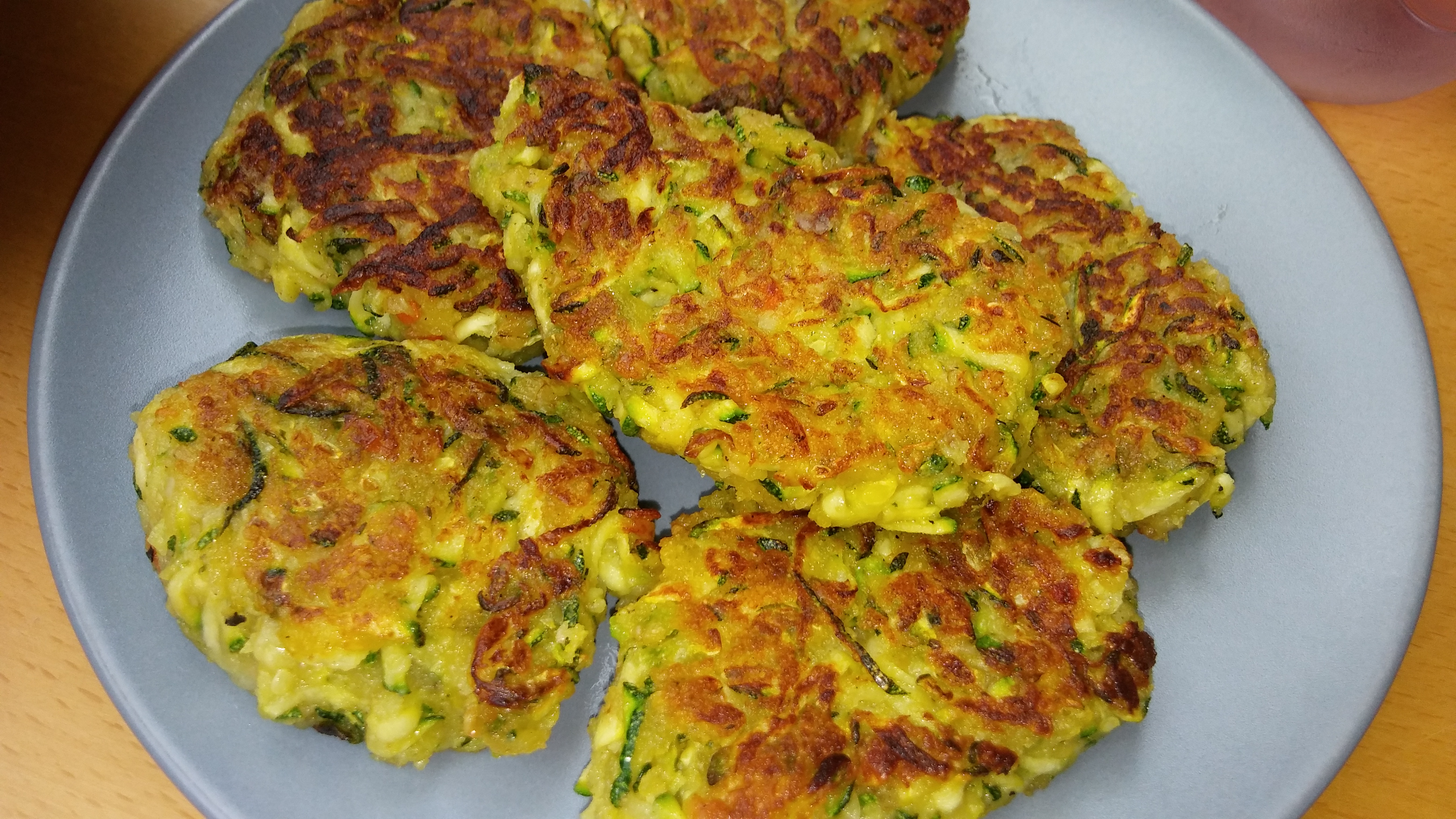 Zucchini und Zwiebel raspeln, Knoblauchzehe dazupressen, alles andere dazumischen und am Ende Semmelbrösel hinzufügen bis eine zähe, nicht mehr zu feuchte Masse entsteht. In der Pfanne mit genügend Öl portionsweise von beiden Seiten goldbraun braten.