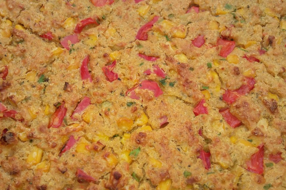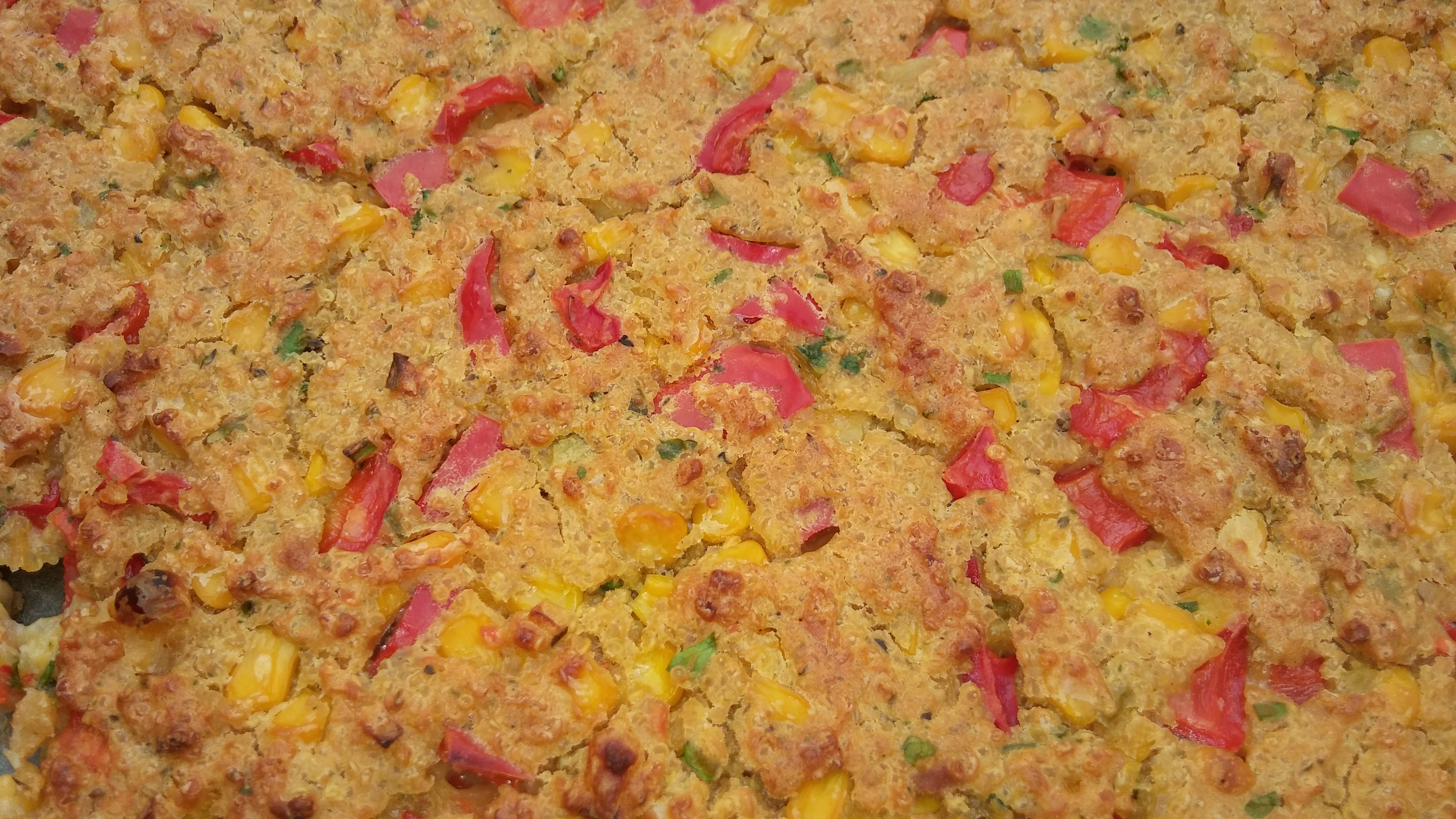 Den Quinoa nach Packungsanleitung kochen. In der Zwischenzeit Zwiebel fein hacken und andünsten, Paprika klein würfeln und dazugeben.Nur kurz weiterdünsten. Pfanne vom Herd nehmen und Mehl, Backpulver, Sojamehl und Mandelmusaufstrich einrühren. Etwas Hafermilch dazugeben- es sollte eine zähe Masse entstehen. Schnittlauch und Petersilie kleinschneiden und mit dem abgetropften Mais unterrühren. Die Masse würzen und kräftig mit Salz und Pfeffer abschmecken. Alles auf ein mit Backpapier ausgelegtes blech streichen und ca. 40 Minuten bei 180 Grad Umluft backen.