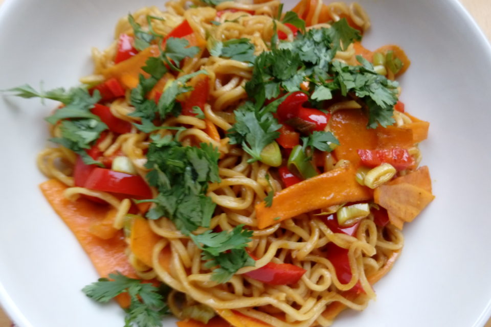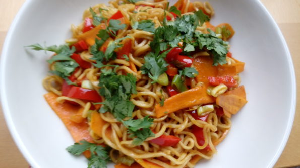 Die Nudeln nach Packungsanweisung kochen, Karotten in feine Stifte, Paprika in kleine Würfel und Lauch in dünne Ringe schneiden. Lauch,Paprika und Karotten in Sesamöl andünsten, Die Currypaste zugeben und dann die Nudeln dazumischen- mit Sojasoße abschmecken. Mit gehacktem Koriander sevieren.