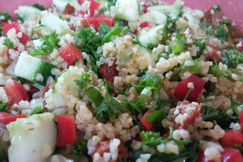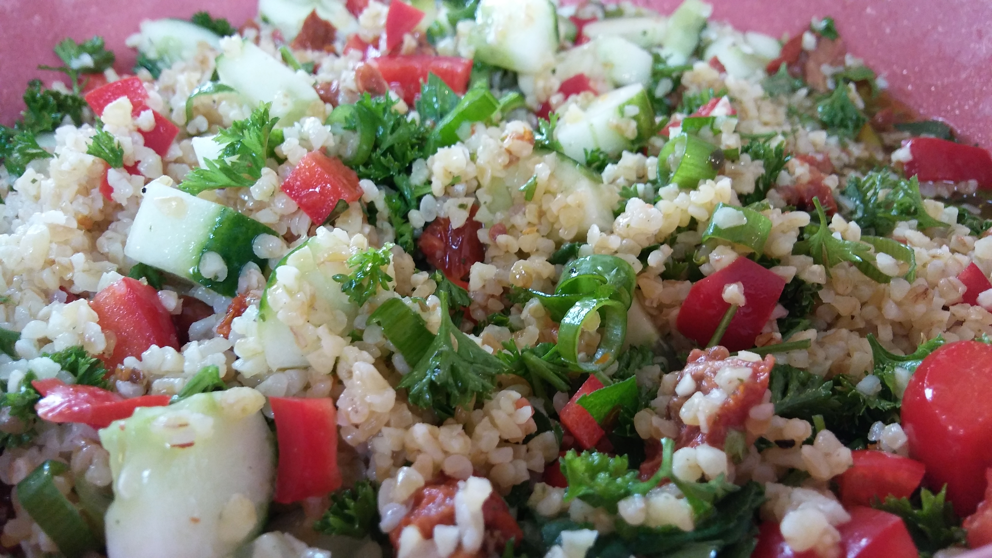Bulgur mit der entsprechenden Menge kochendem Wasser und etwas Gemüsebrühe verrühren und ziehen lassen. Zitrone auspressen und den Saft mit etwas mehr als der gleichen Menge OLivenöl vermengen. Paprika und Lauchzwiebeln kleinschneiden und die Kräuter fein hacken. Alles vermengen und mit Salz und Pfeffer abschmecken. Weiter ziehen lassen und verzehren sobald der Bulgur weich ist.
