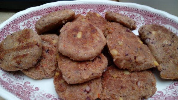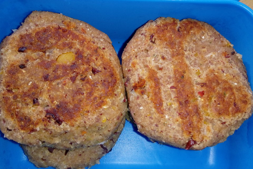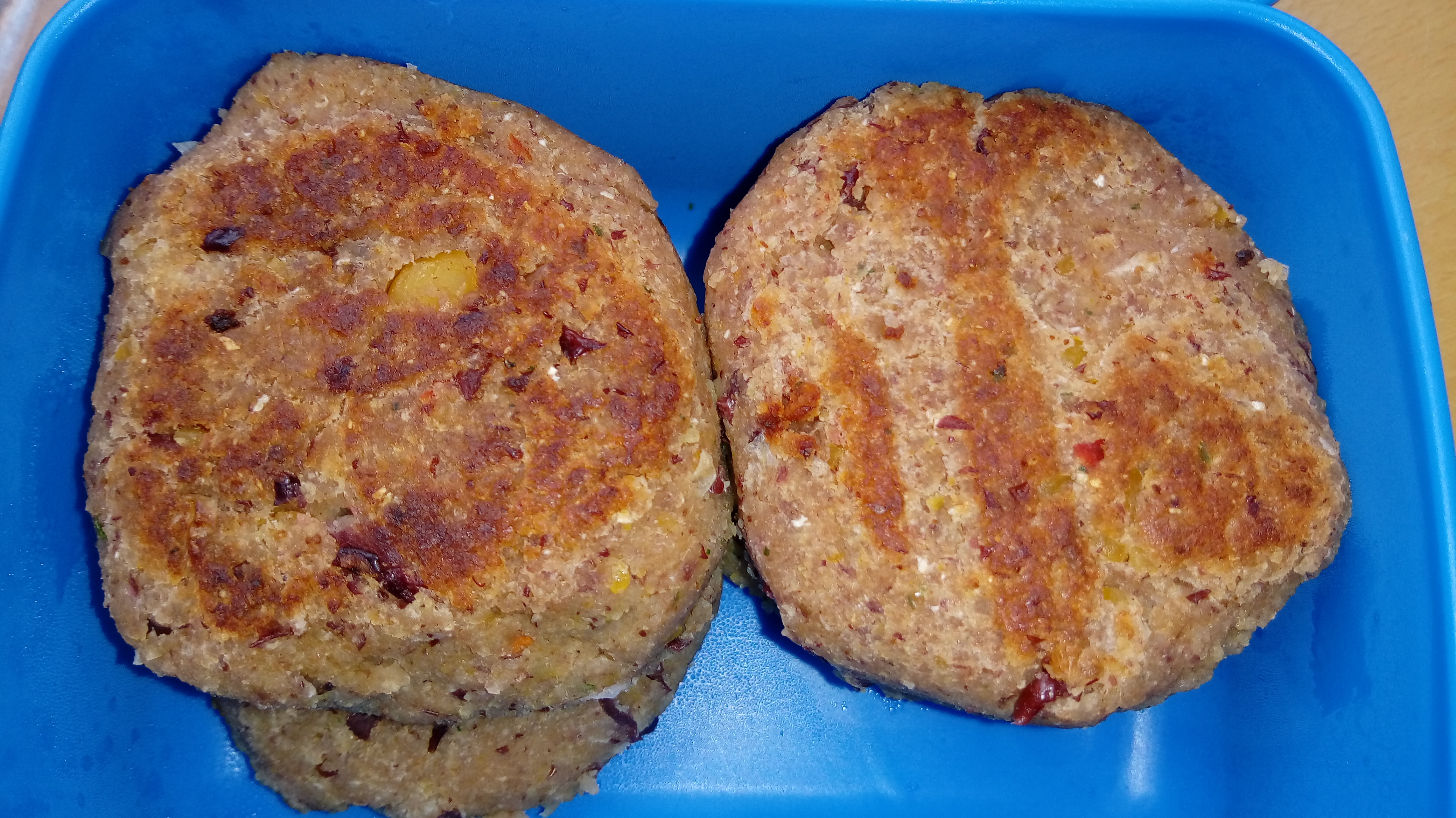 Alles zusammen pürieren und so viel Hartweizengrieß und Semmelbrösel hinzufügen bis eine gut formbare, kompakte Masse entsteht. Zu Burgern formen und im heißen Öl braten.