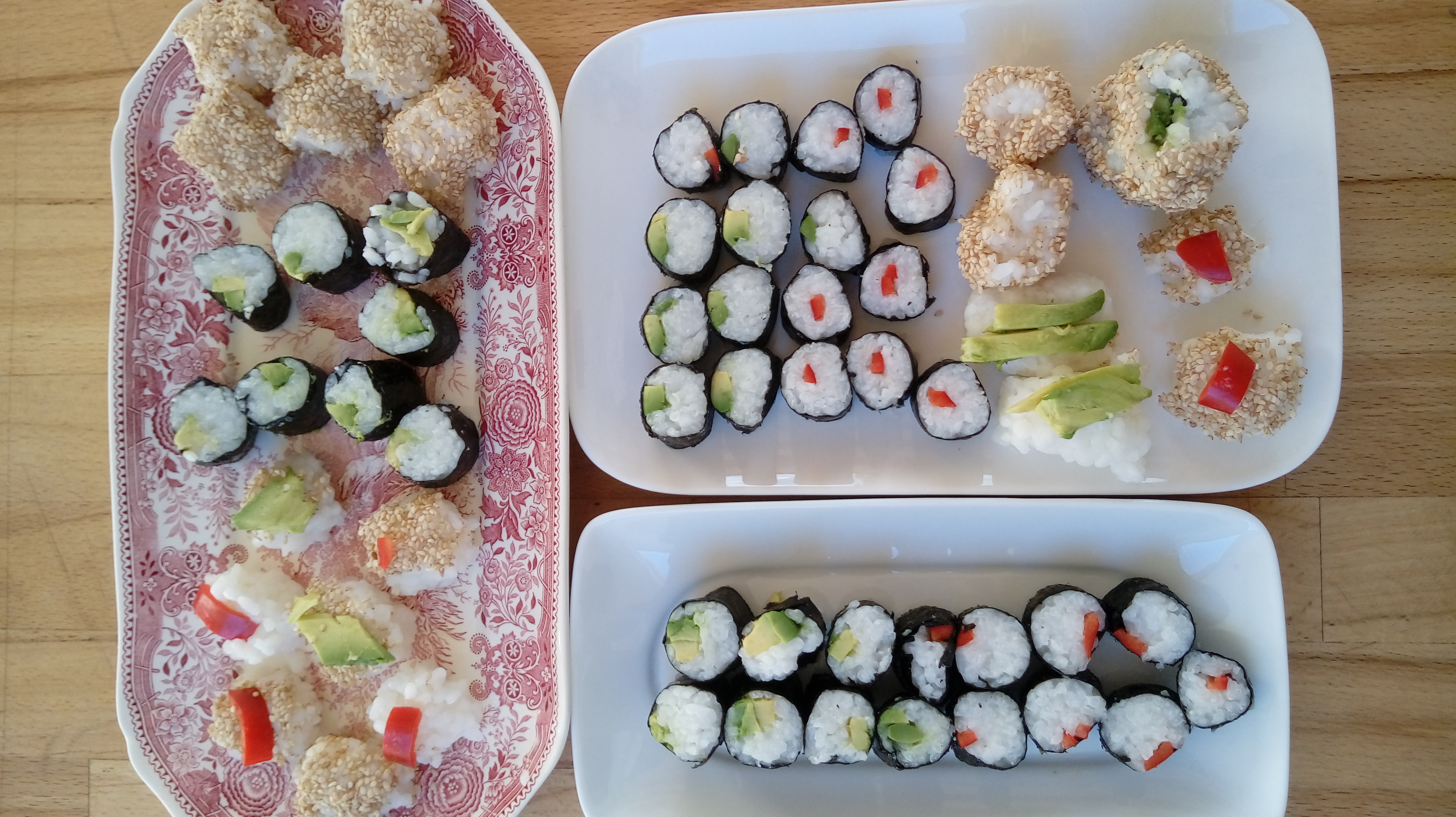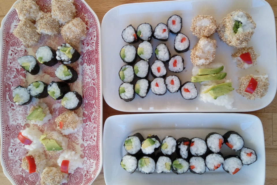 Sushireis nach Packungsanleitung zubereiten (wichtig ist der Reisessig!), auf Noriblätter streichen und mit Paprika oder Avocado füllen. In Stücke schneiden und mit Sojasoße genießen! Lecker sind auch simple Reisbällchen- in Sesam gewälzt oder mit Avocado bzw. Paprika garniert!