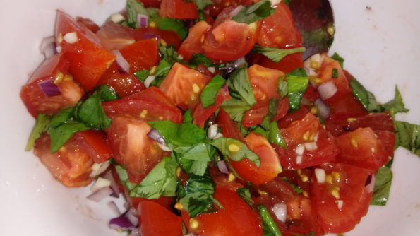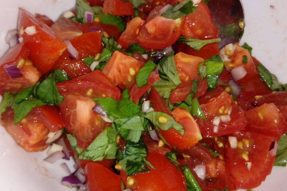 Tomaten würfeln, Zwiebel und Knoblauch fein würfeln und dazugeben. Basilikum in feine Streifen schneiden. Kräftig mit Pfeffer und Salz würzen. Eine Stunde stehen lassen- überschüssiges Tomatenwasser abgießen und dann erst das Öl zugeben.