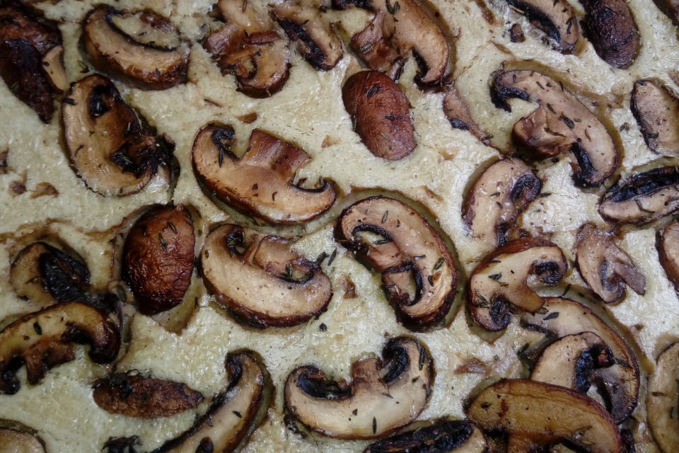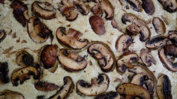 Die Creme auf dem ausgerollten Blätterteig verteilen. Mit den Pilzen belegen und ca. 20 minten bei 180 Grad Umluft backen.