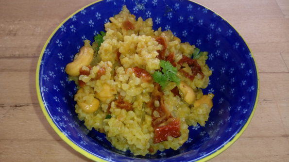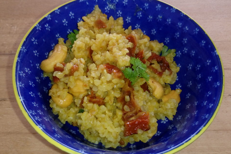 Bulgur mit Tomaten, Petersilie, Cashewkernen und Dressing mischen.