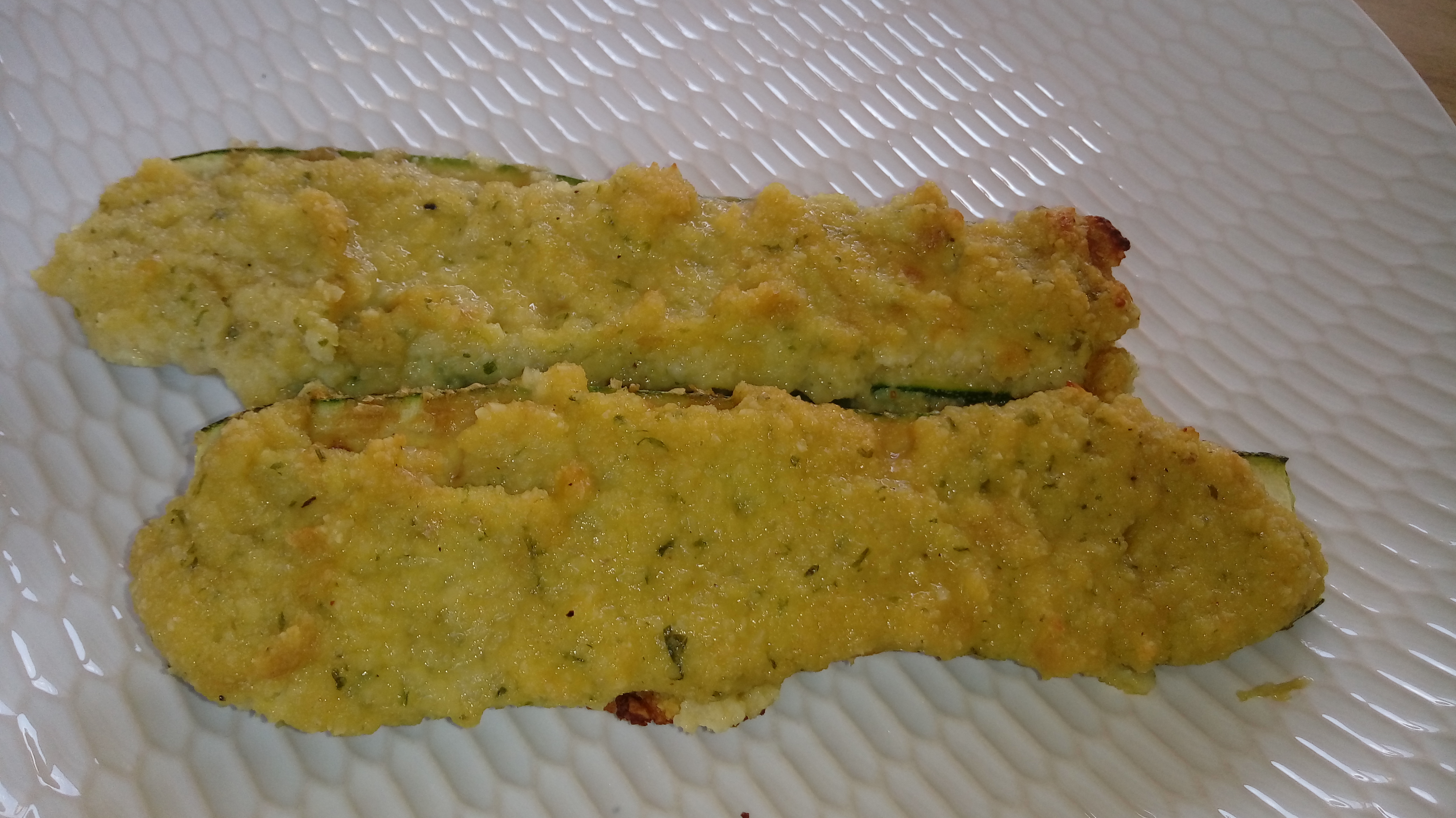 Die Zucchini in etwas mehr als 0,5 cm dicke Streifen schneiden. Die anderen Zutaten grob zu einer Paste mixen und auf den Streifen verteilen. Bei 180 Grad Umluft ca. 15- 20 Minuten backen.