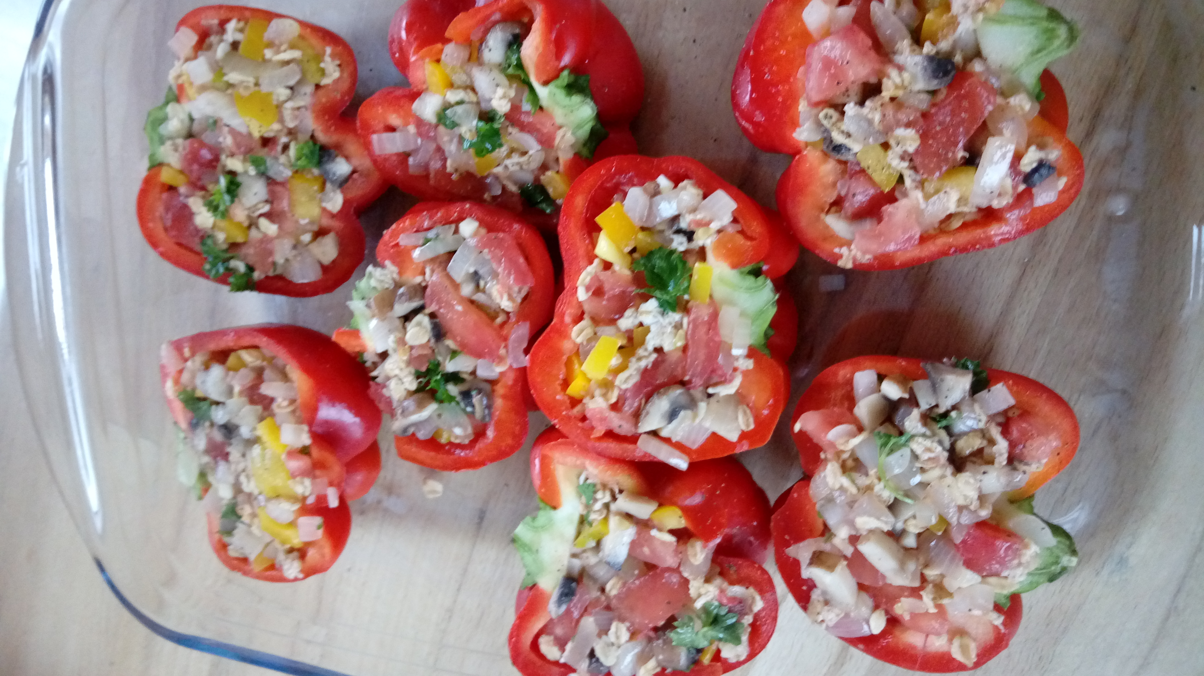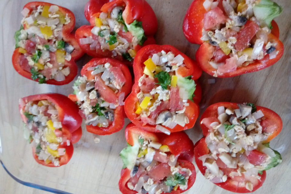 Zwiebel-Pilz- Mischung, Tomaten, Haferflocken, Paprikastreifen und Knoblauch mischen und kräftig mit Salz und Pfeffer abschmecken. Die Paprikahälften damit füllen und dann in eine Auflaufform setzen. Die Gemüsebrühe angießen und bei 180 grad Umluft 20 Minuten backen. Kurz herausnehmen und auf jeder Hälfte etwas mandelmusaufstrich verteilen. Weitere 10 Minuten backen.