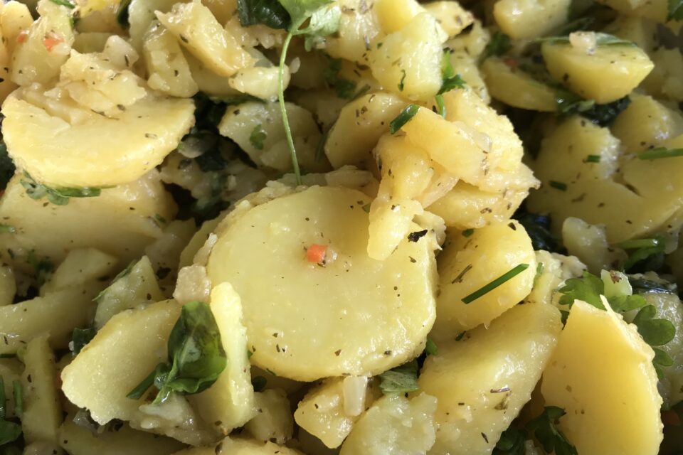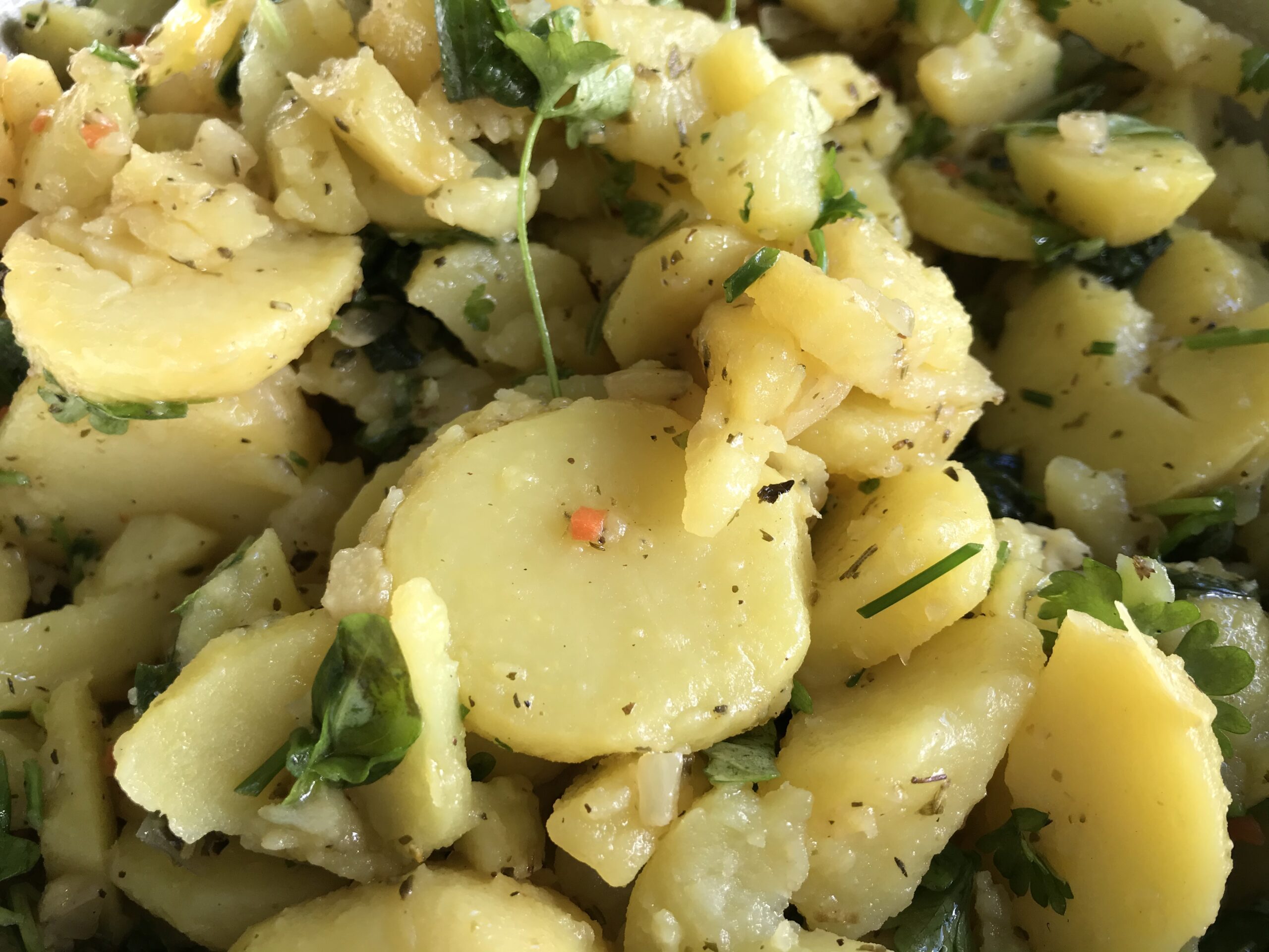 Die Kartoffeln pellen und in Scheiben schneiden. Eine Lage Kartoffeln in eine Schüssel geben und gehackte , frische Kräuter daraufstreuen. Wieder eine Lage Kartoffeln und darauf Kräuter, usw. Papa: “Man sollte nicht zuviele Kräuter nehmen, aber auch nicht zuwenig”. Zum Schluss die Brühe mit Essig und Salz abschmecken – entweder nur Essig Essenz oder auch einen Teil Balsamico- und über die Kartoffeln geben. Gut vermischen und lange- am besten über Nacht – ziehen lassen.