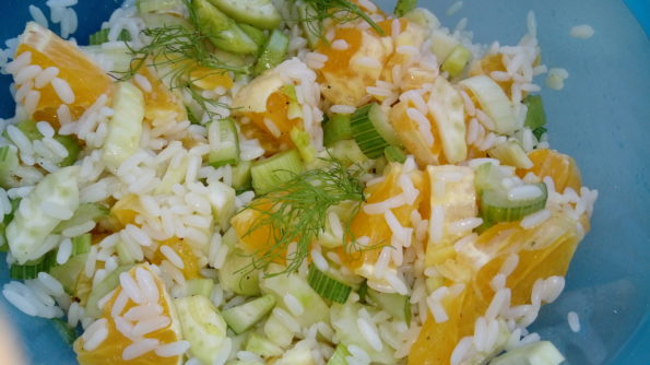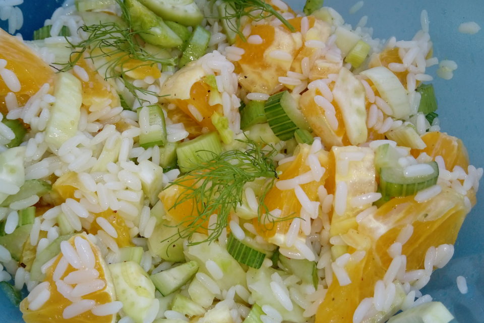 Fenchel waschen und kleinschneiden, Orange pellen und kleinschneiden. Aus den restlichen zutaten eine Marinade anrühren und mit Reis, Orange und Fenchel mischen. Es passt auch gut eine halbe, kleingeschnittene rote Zwiebel dazu.