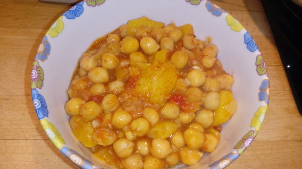 Zwiebeln, Knoblauch und Ingwer fein schneiden und in reichlich Öl anbraten. Gewürz dazu. Mit Wasser ablöschen, Tomaten und Kichererbsen zugeben. Gut 15-20 Minuten köcheln lassen. Am Ende Kartoffeln grob mit den Händen zerdrücken und mitköcheln. Am Ende den Saft einer halben Zitrone unterrühren.