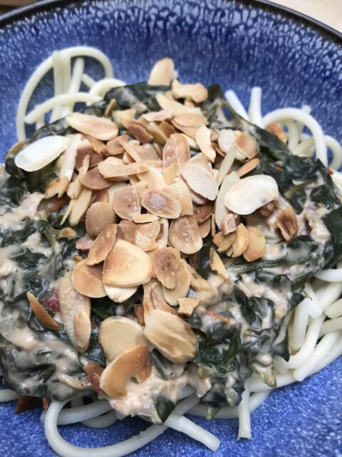 1 Zwiebel 2 kleine Knoblauchzehen 4 getrocknete Tomaten (in Öl) 200g Babyspinat…